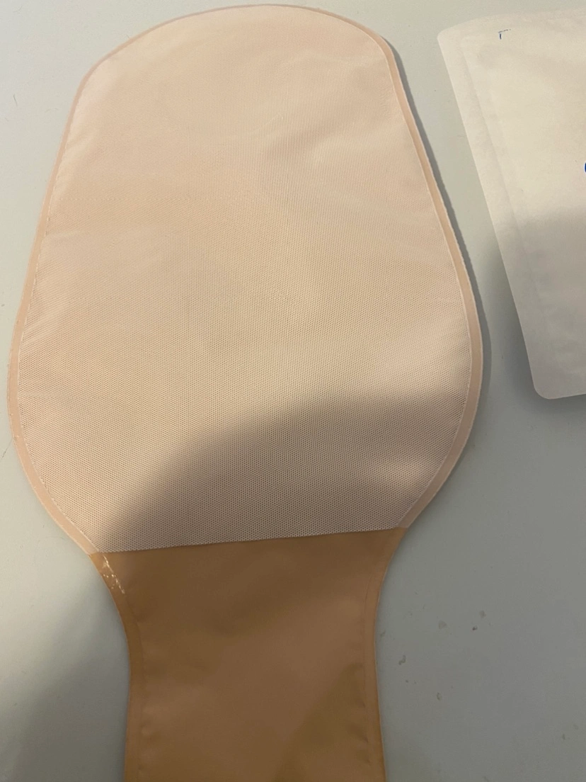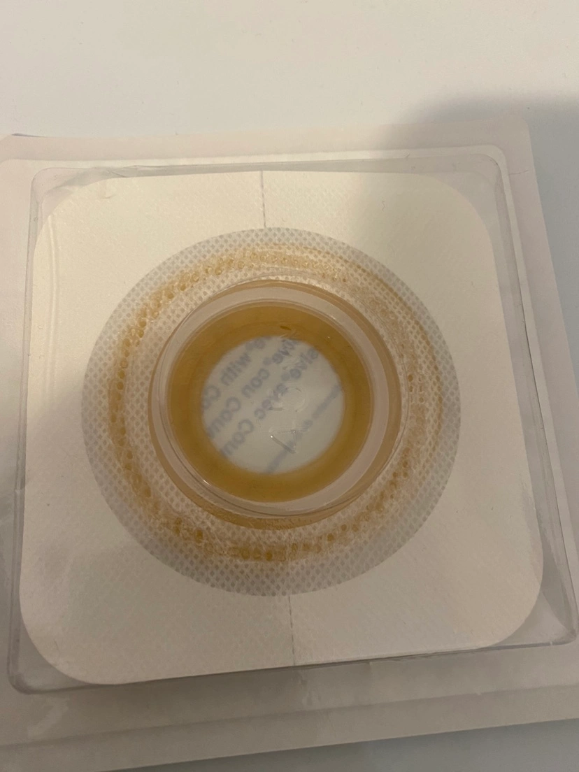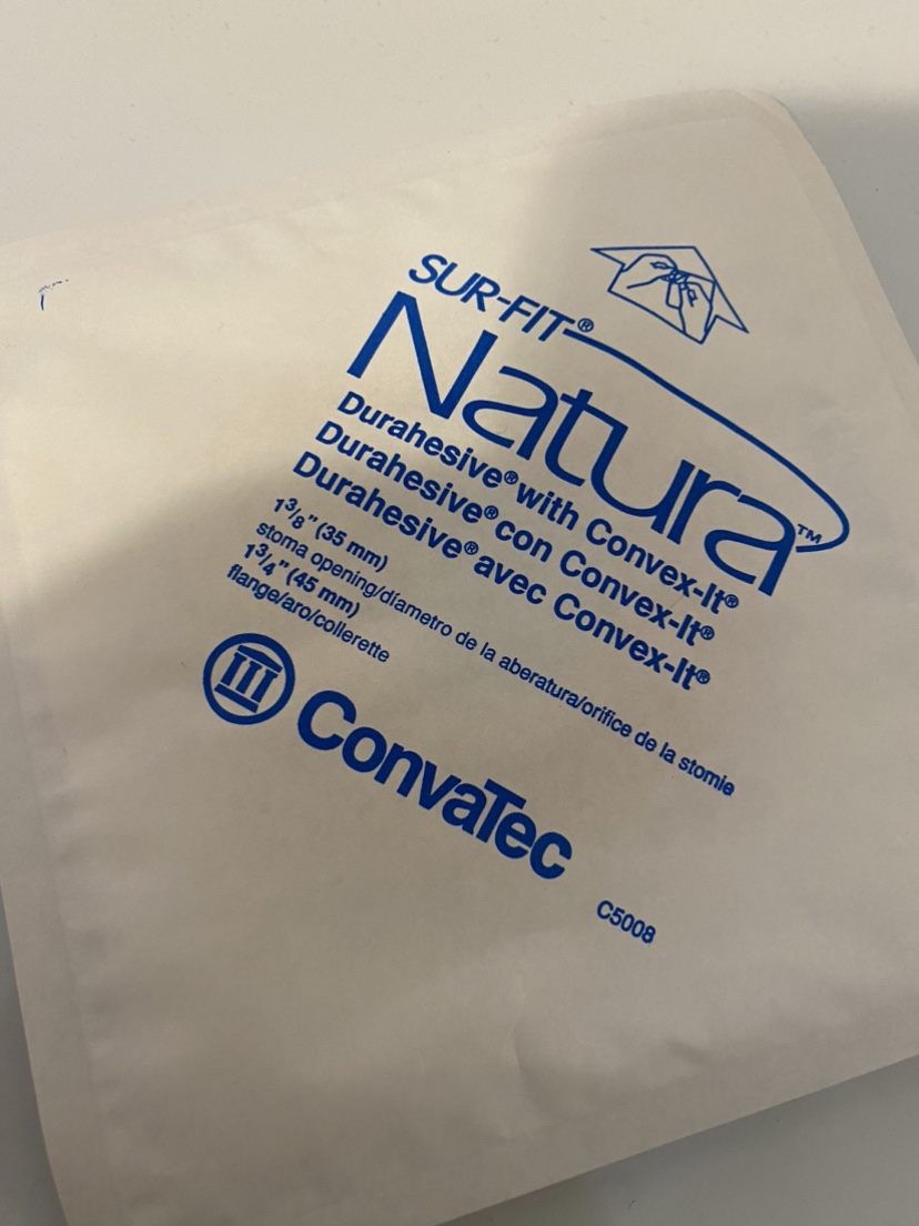 ConvaTec Natura Durahesive Ostomy Pouch with a 1 3/8" opening. The pouch is beige and the flange is brown. It comes in a sealed package with a convex-it insert. The item is brand new. There are 20 bags 1 clip and 15 wafers pre cut at 30 mm