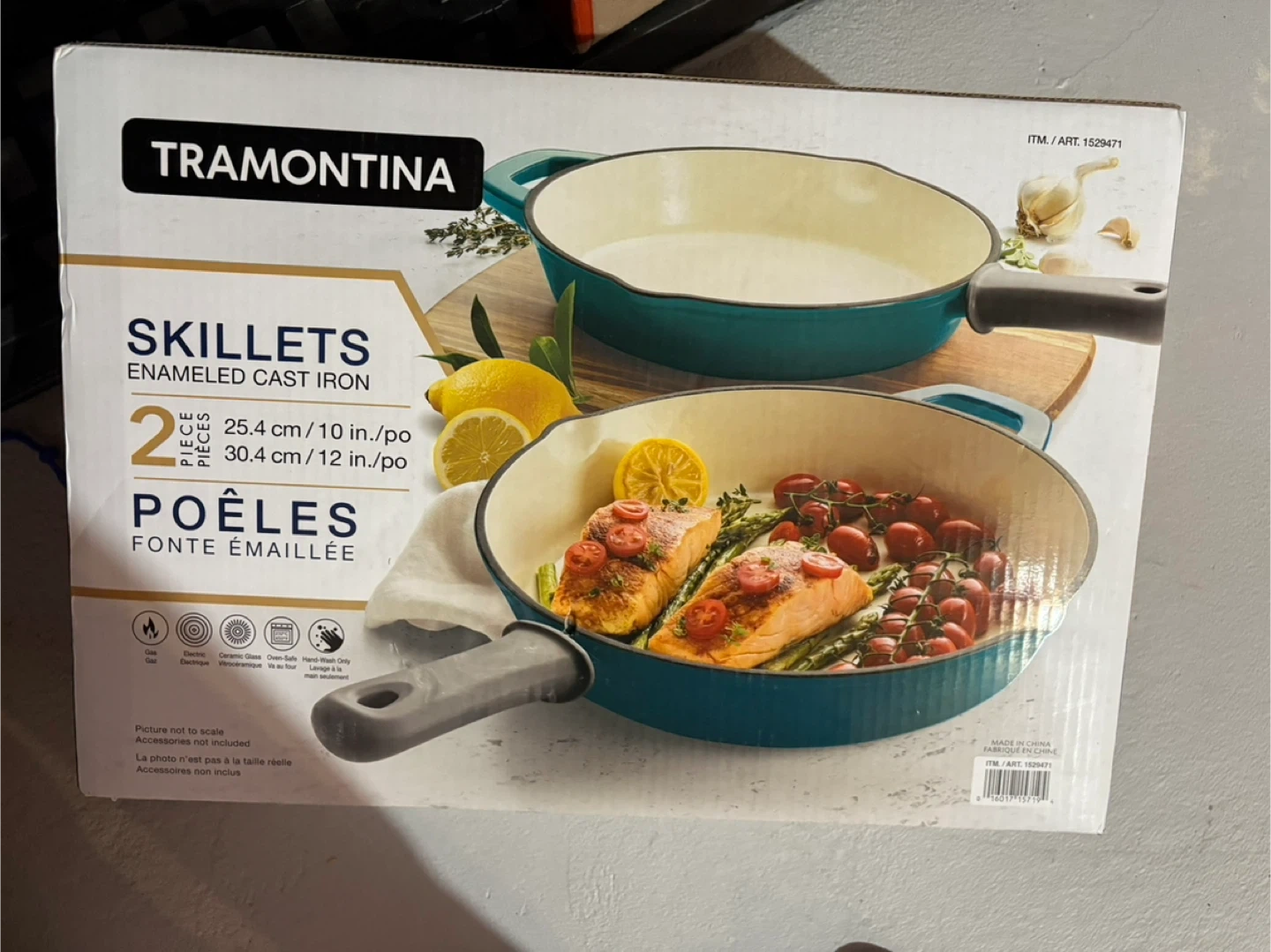 This set includes two enameled cast iron skillets, one 25.4 cm/10 in. and one 30.4 cm/12 in. They're suitable for use on all cooktops and are dishwasher safe. Enameled cast iron construction ensures even heating and durability.