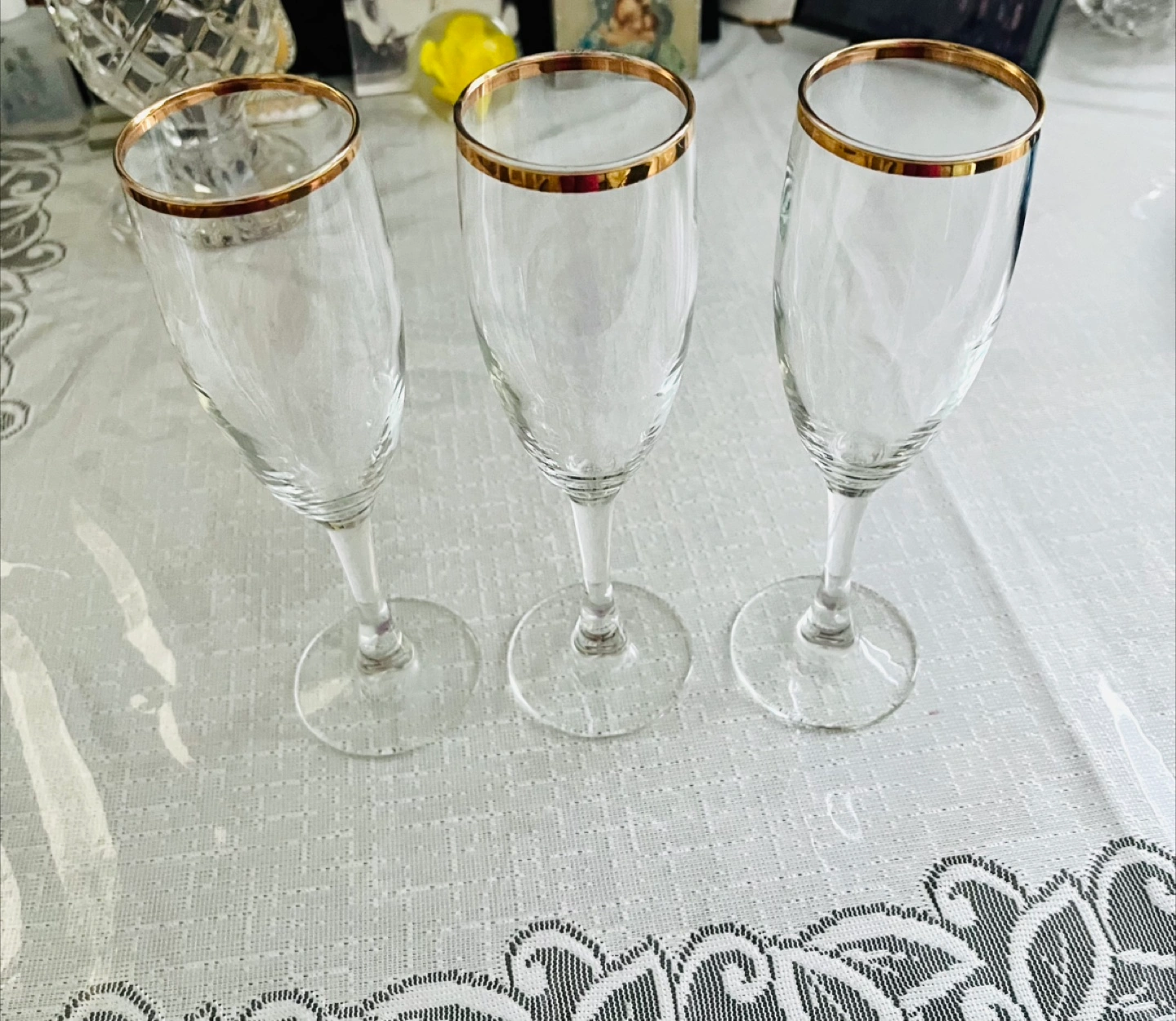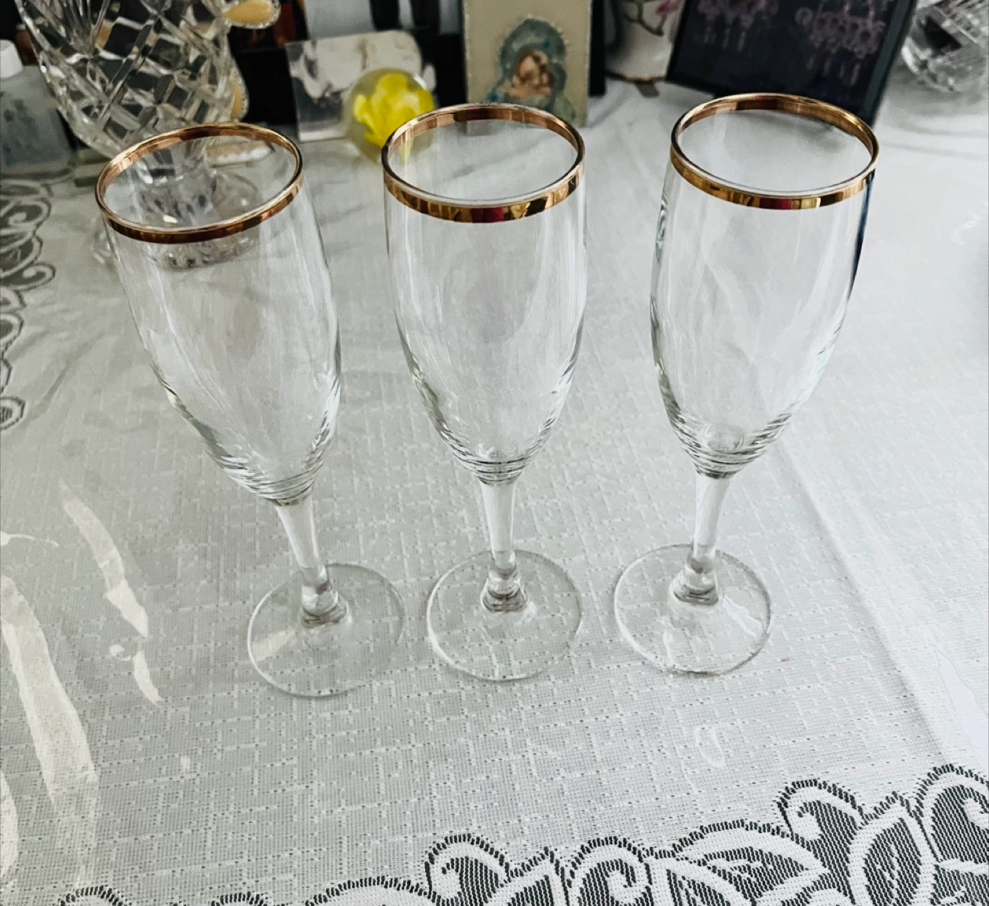 Buy & SellSet of 3 Champagne Flutes with Gold RimSet of 3 Champagne Flutes with Gold Rim$3Three elegant glass champagne flutes are featured. Each glass has a delicate gold rim around the top. Excellent Condition!ConditionLike newWHERE TO MEETSuperfreshView MapSELLERverifiedMaria SBay Ridge19512 reviews1 chats·2 favorites·9 viewsSEND CHAT TO SELLERHi Maria S! I’m interested in your listing.Hi Maria S! I’m interested in your listing.Get the Karrot app to chatSign In to chat