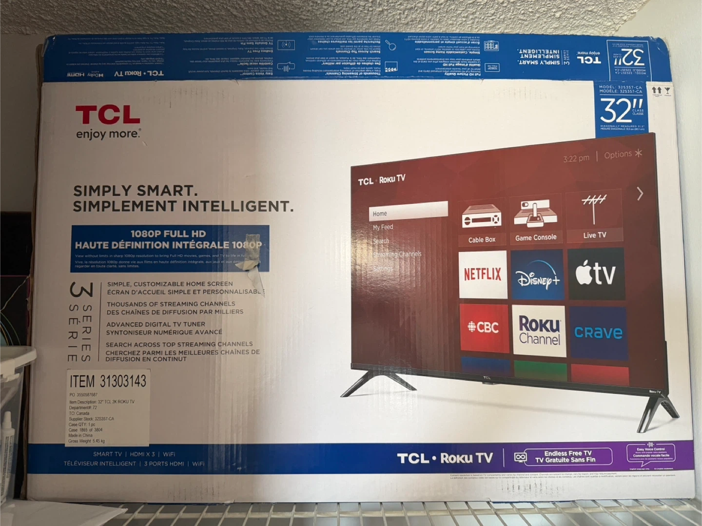 This is a 32-inch TCL Roku Smart TV with 1080p Full HD resolution. It offers a simple, customizable smart home screen and thousands of streaming channels. It includes HDMI, 3 ports, and Wi-Fi connectivity.
