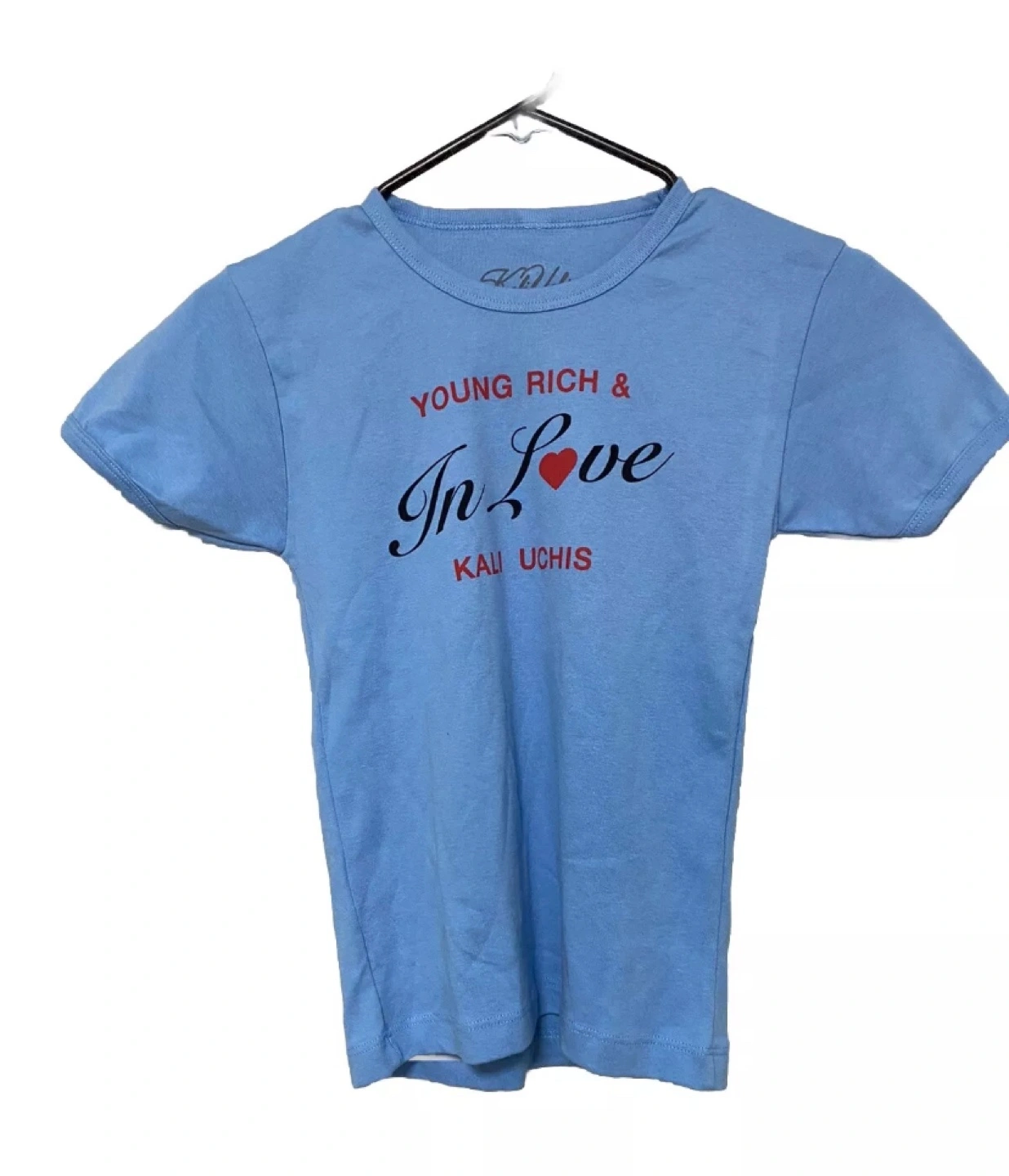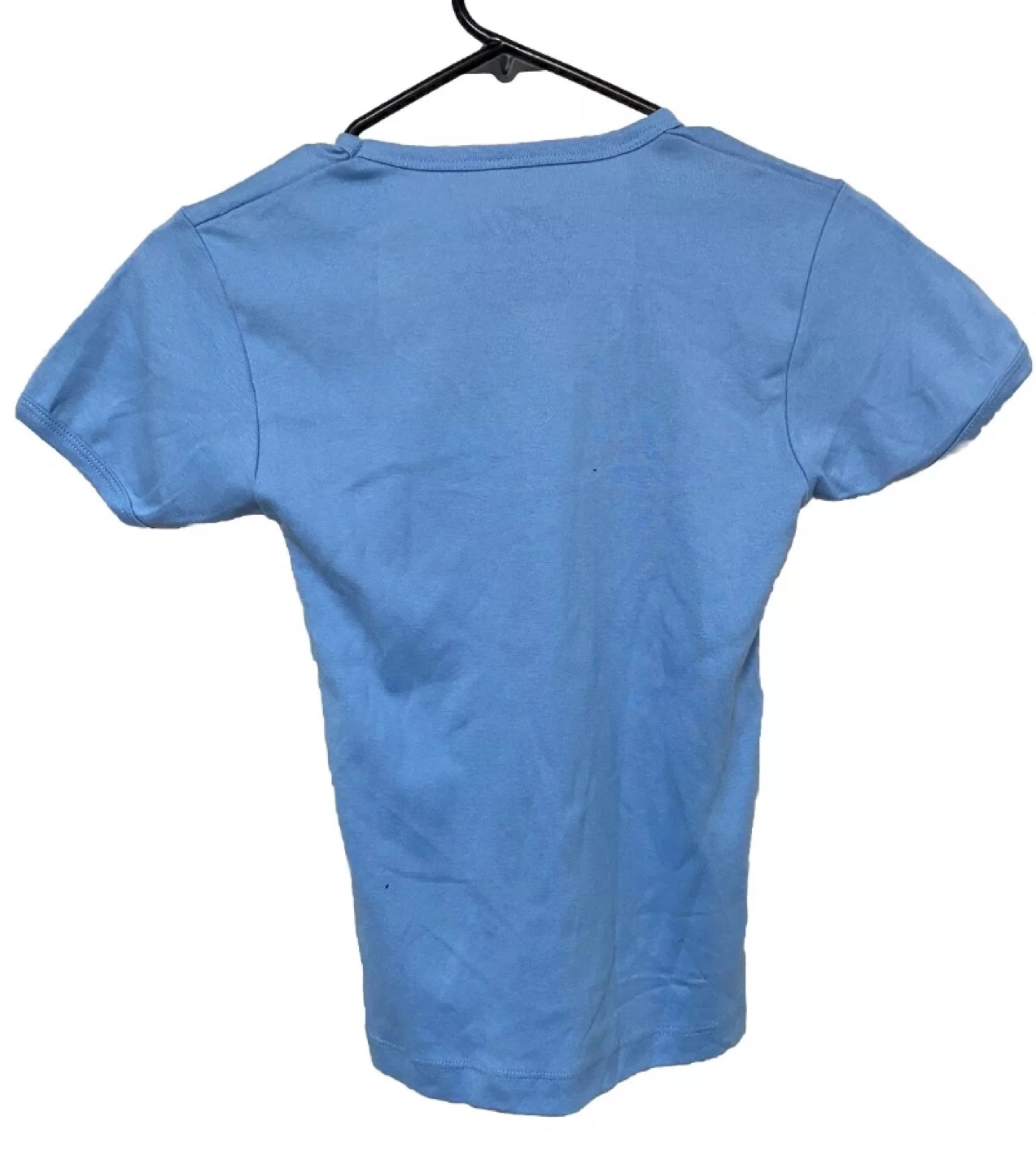 Blue short-sleeved T-shirt with graphic print. Size S. 100% cotton. Made in the U.S.A.