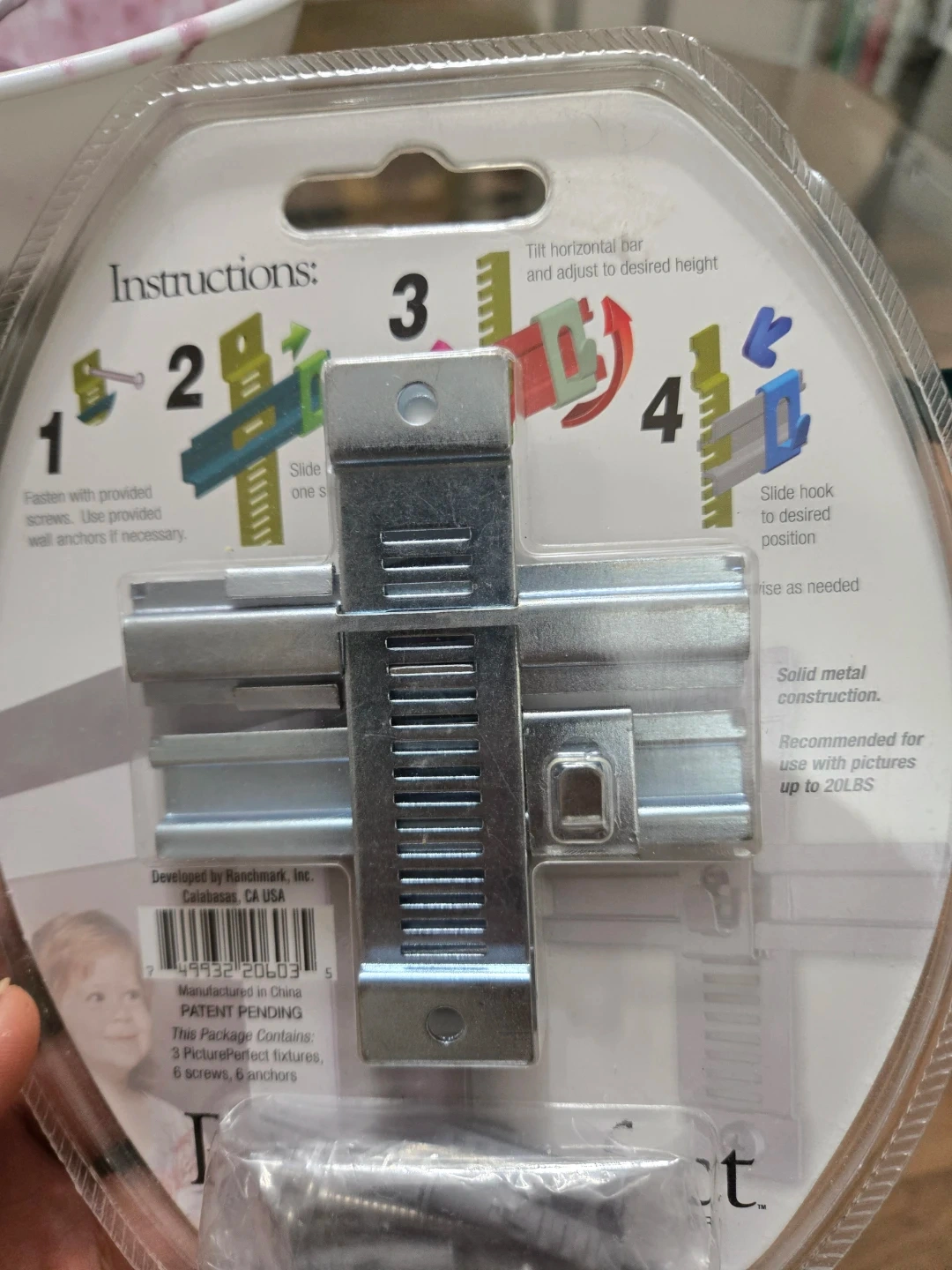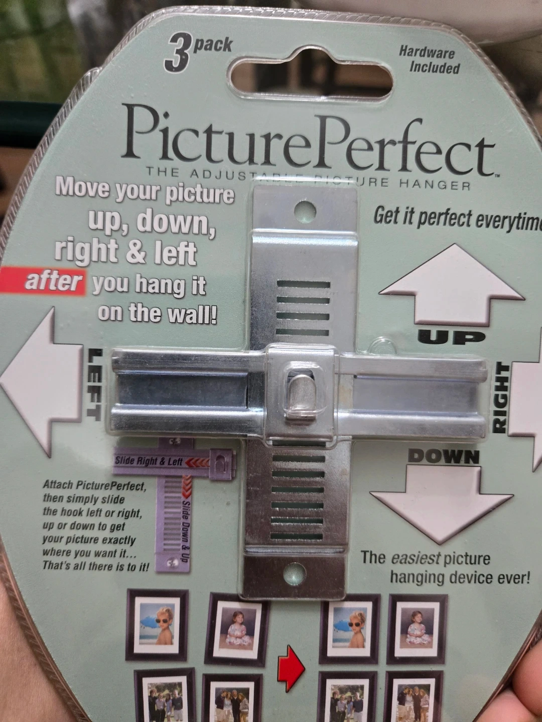 This is a 3-pack of adjustable picture hangers made with solid metal construction. It's recommended for use with pictures up to 20 lbs. This device allows you to move your picture up, down, right, and left after hanging it on the wall.