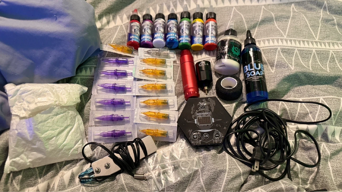 This kit includes a variety of tattoo ink colours, needles, a tattoo machine, a power supply, and blue soap. It's everything you need to get started. The power supply shows "Wormhole" branding.