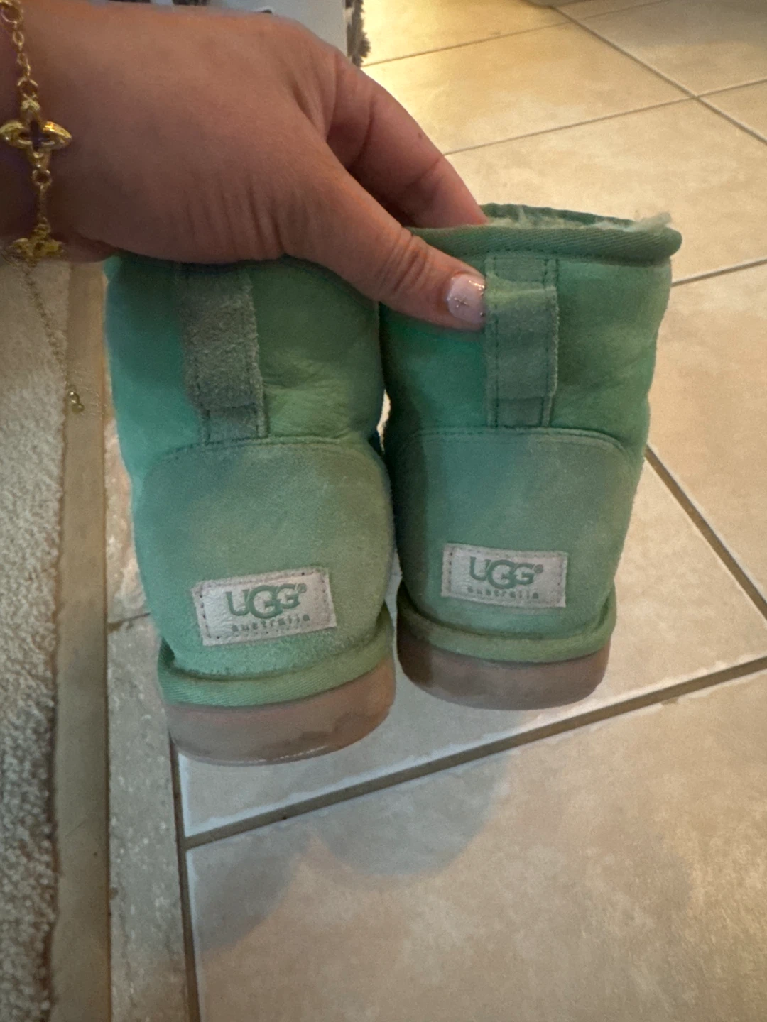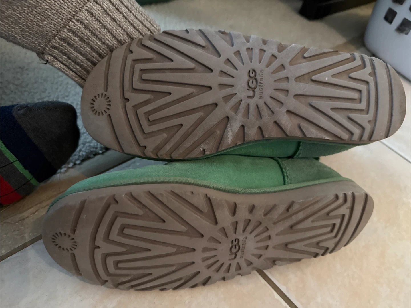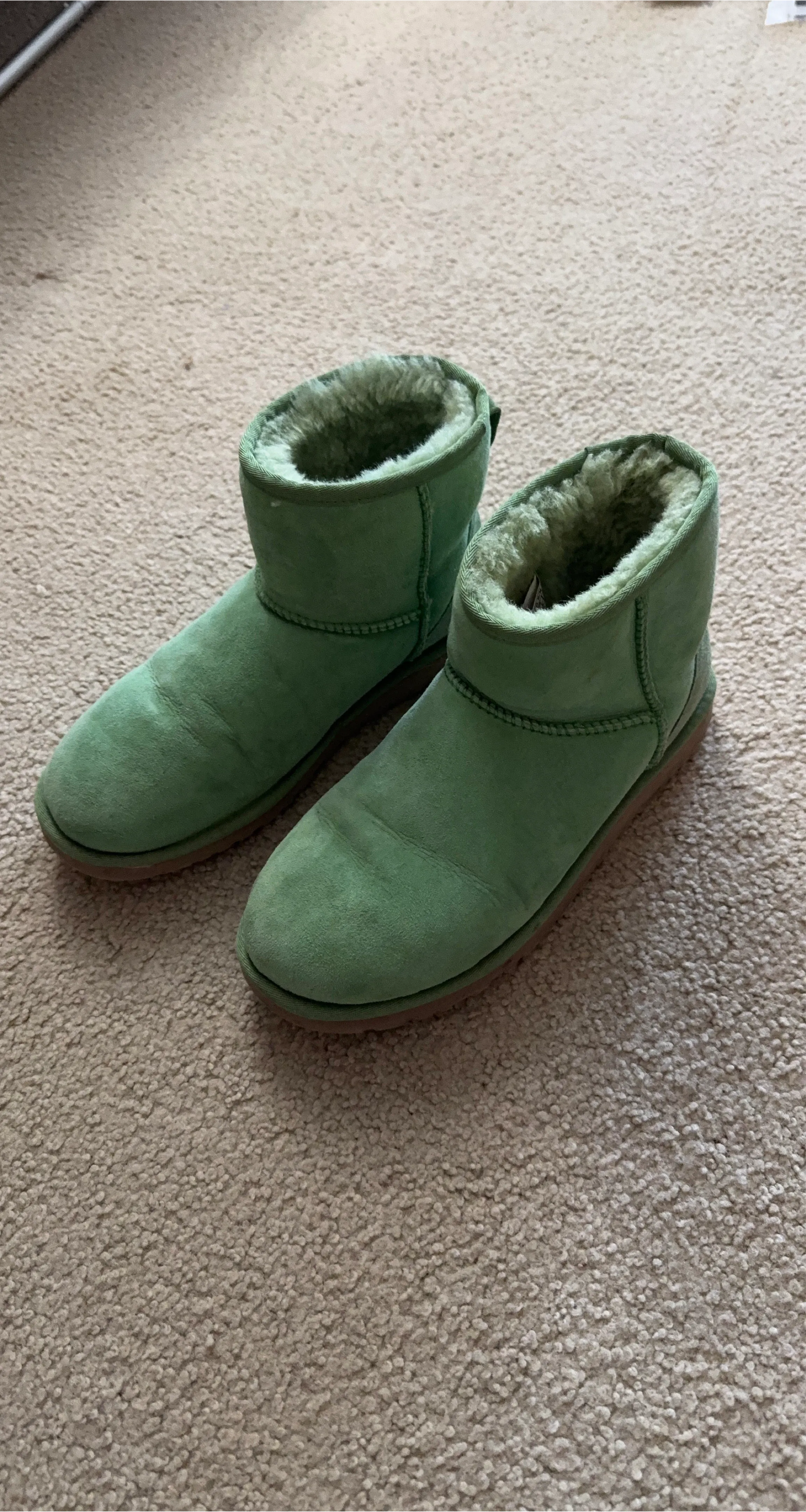 Selling a pair of UGG Classic Mini boots in a lovely green colour. These cozy boots are perfect for keeping your feet warm and stylish during the colder months. They show some signs of wear, but still have plenty of life left in them!