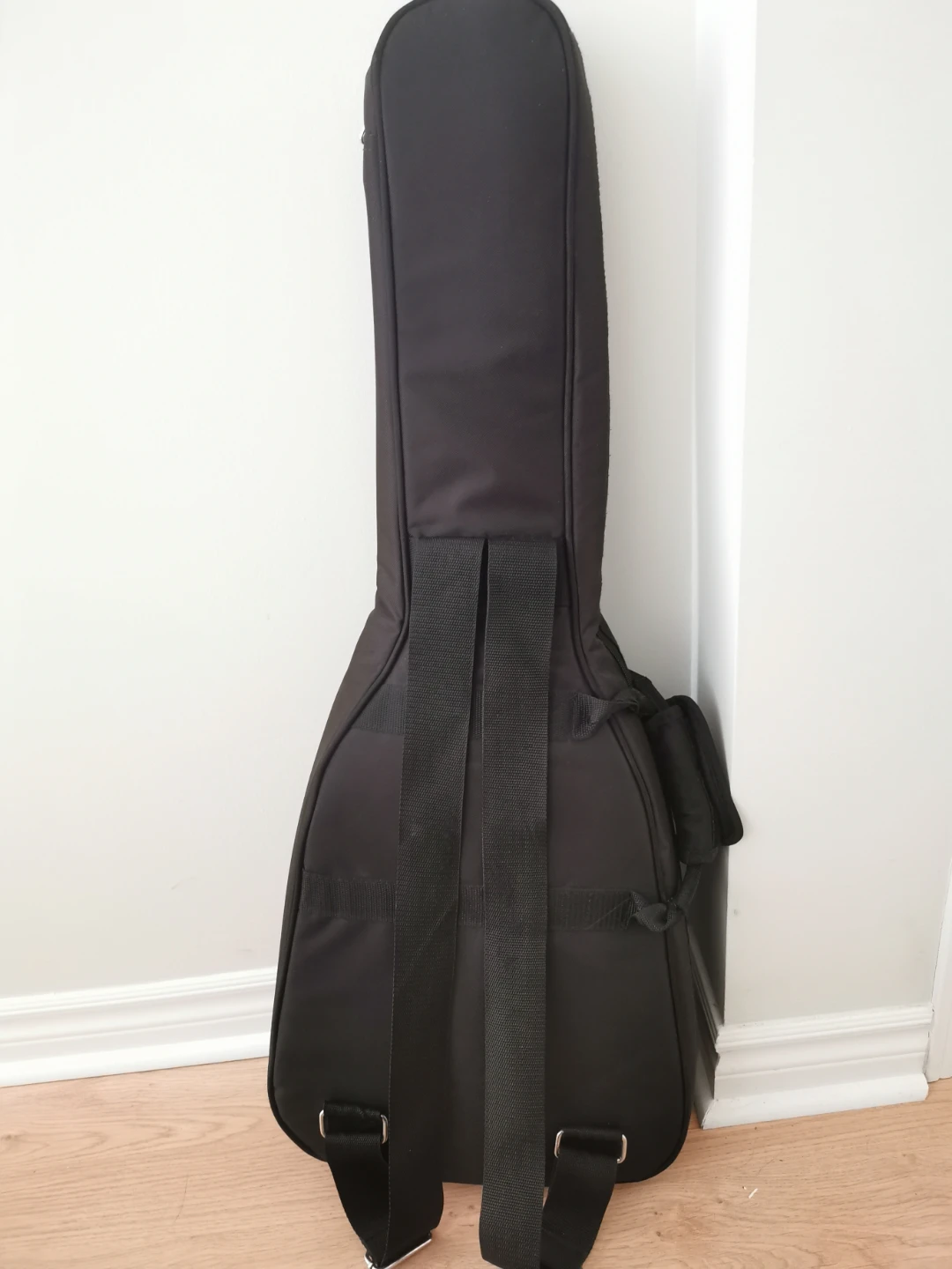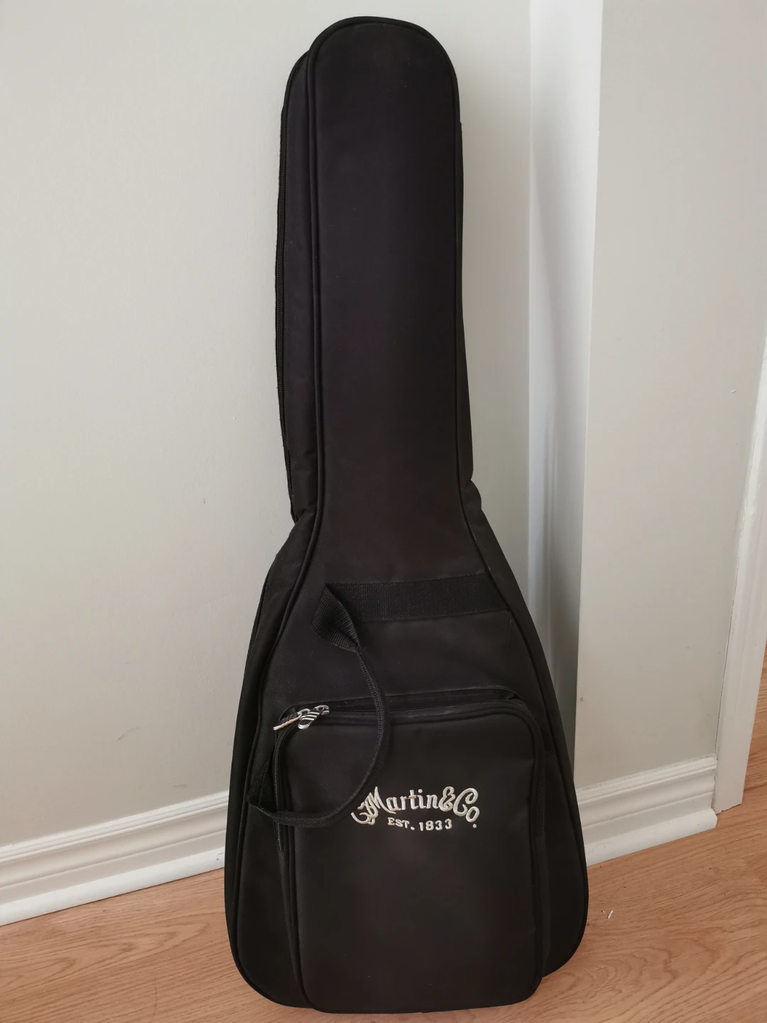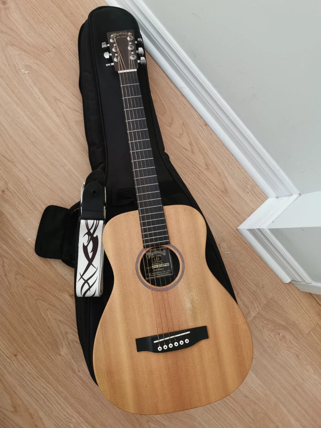This is a Martin LX1 Little Martin guitar with a solid spruce top. It's made in Mexico and comes with its original gig bag. A great travel acoustic!