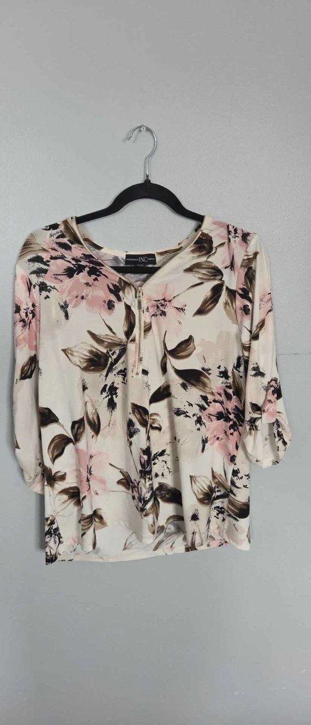 This INC International Concepts top features a floral print with pink and brown accents. It has a quarter-zip neckline and 3/4 sleeves. The fabric is a soft blend, perfect for everyday wear.