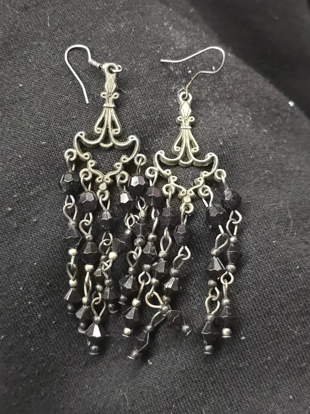 These vintage-style chandelier earrings feature silver-toned metalwork with multiple strands of faceted black beads. They dangle beautifully and add a touch of gothic elegance to any outfit. The ear hooks are simple and easy to use.
