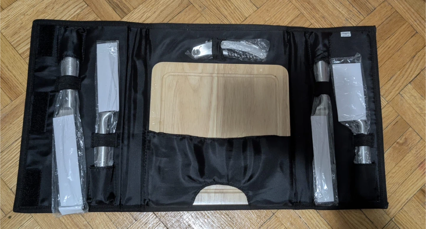 This is a BBQ tool set that comes with a cutting board. The tools appear to be in new condition and still in their original packaging. Perfect for summer barbecues!
