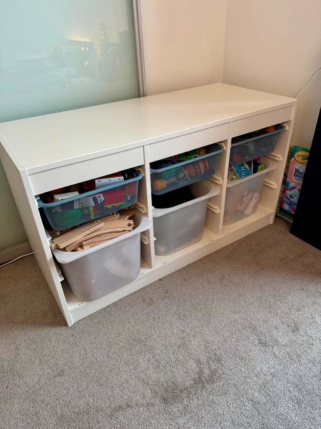 This is a white toy storage unit, perfect for organizing kids' rooms. It includes three open cubbies fitted with blue mesh baskets and grey plastic bins. Its simple design makes it easy to store various toys and games. This unit would be great for keeping play areas tidy!
