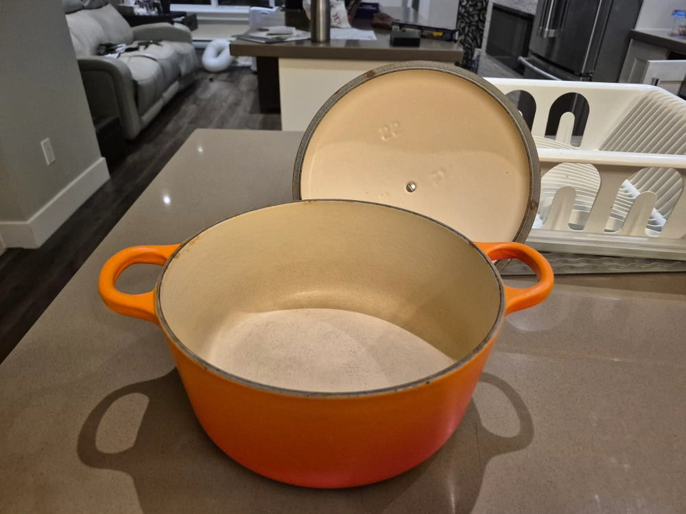 Selling an orange Dutch oven with a lid. It's in great condition and ready for all your cooking needs! It's perfect for stews, soups, and braising