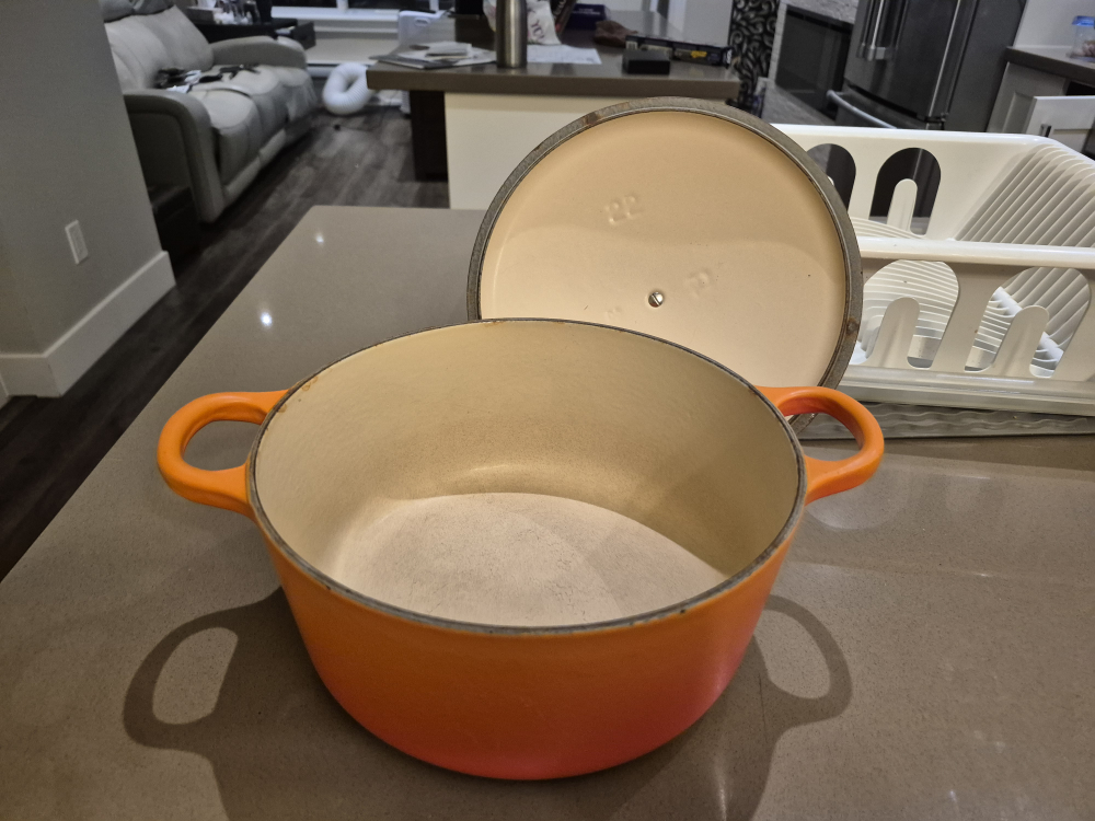 Selling an orange Dutch oven with a lid. It's in great condition and ready for all your cooking needs! It's perfect for stews, soups, and braising