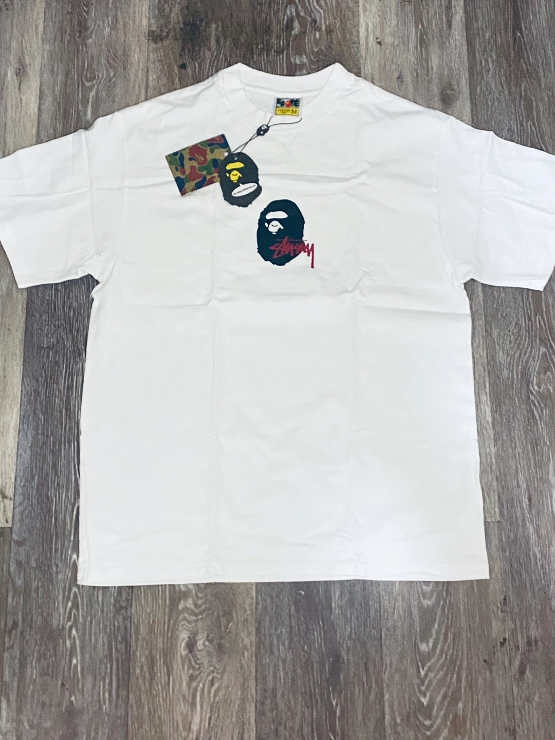 Selling a BAPE (A Bathing Ape) x Stussy collaboration T-shirt in white! This tee features the iconic BAPE ape head combined with the Stussy logo. It's a cool piece for fans of either brand!