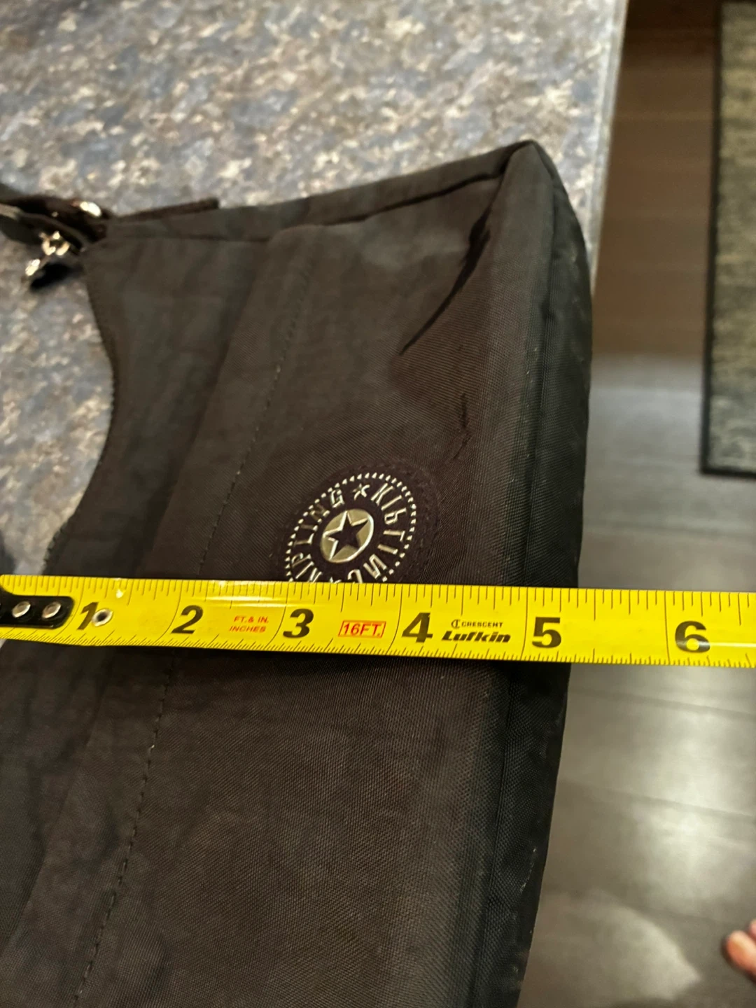 This is a Kipling crossbody bag. It's black and made of nylon. The bag measures approximately 10 inches wide and 5 inches high.