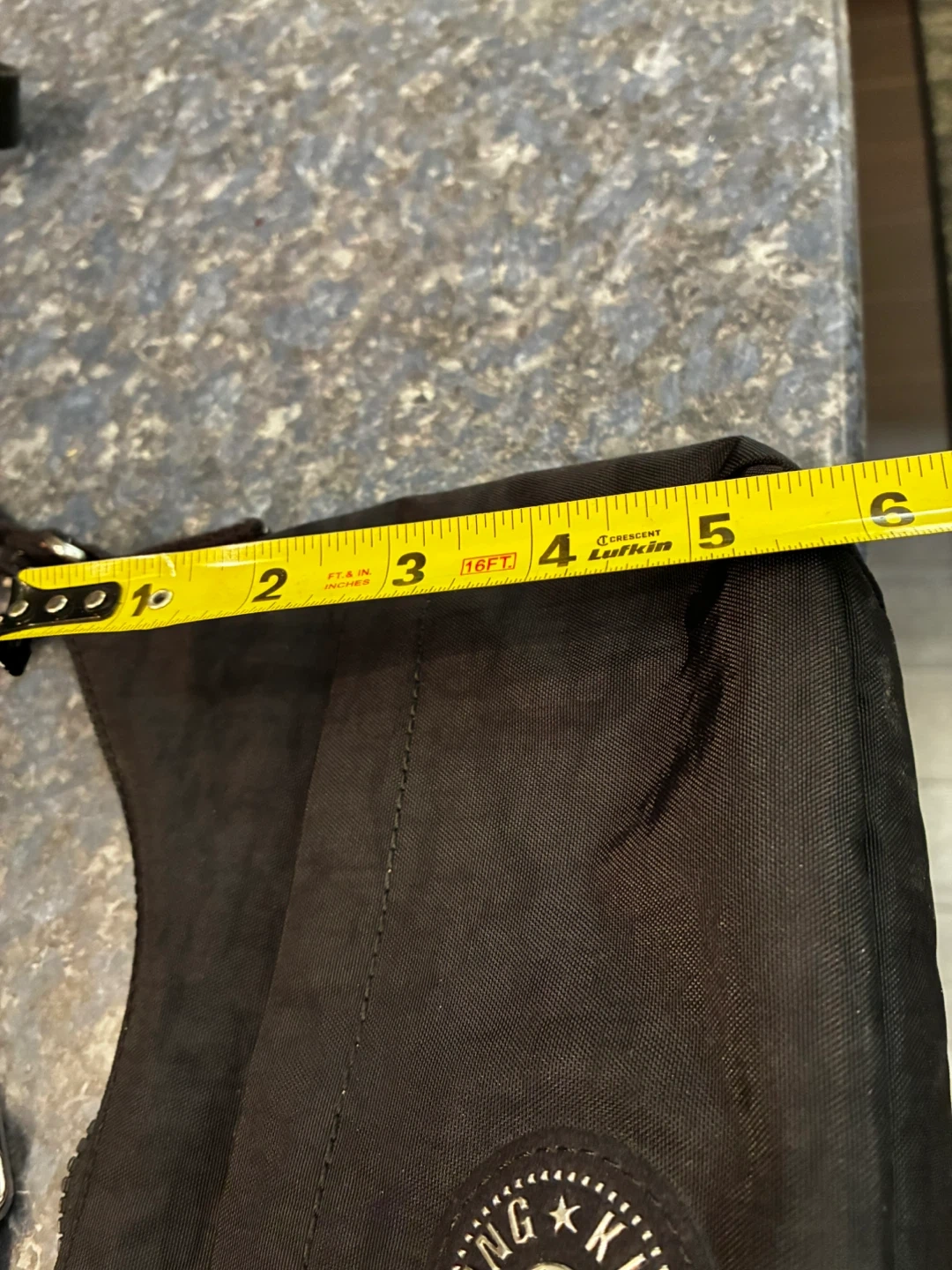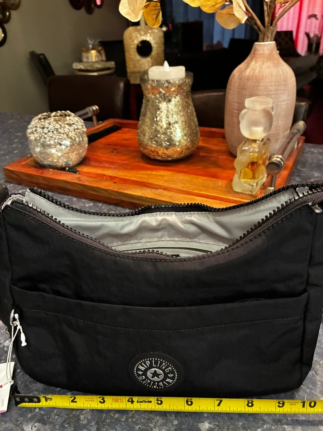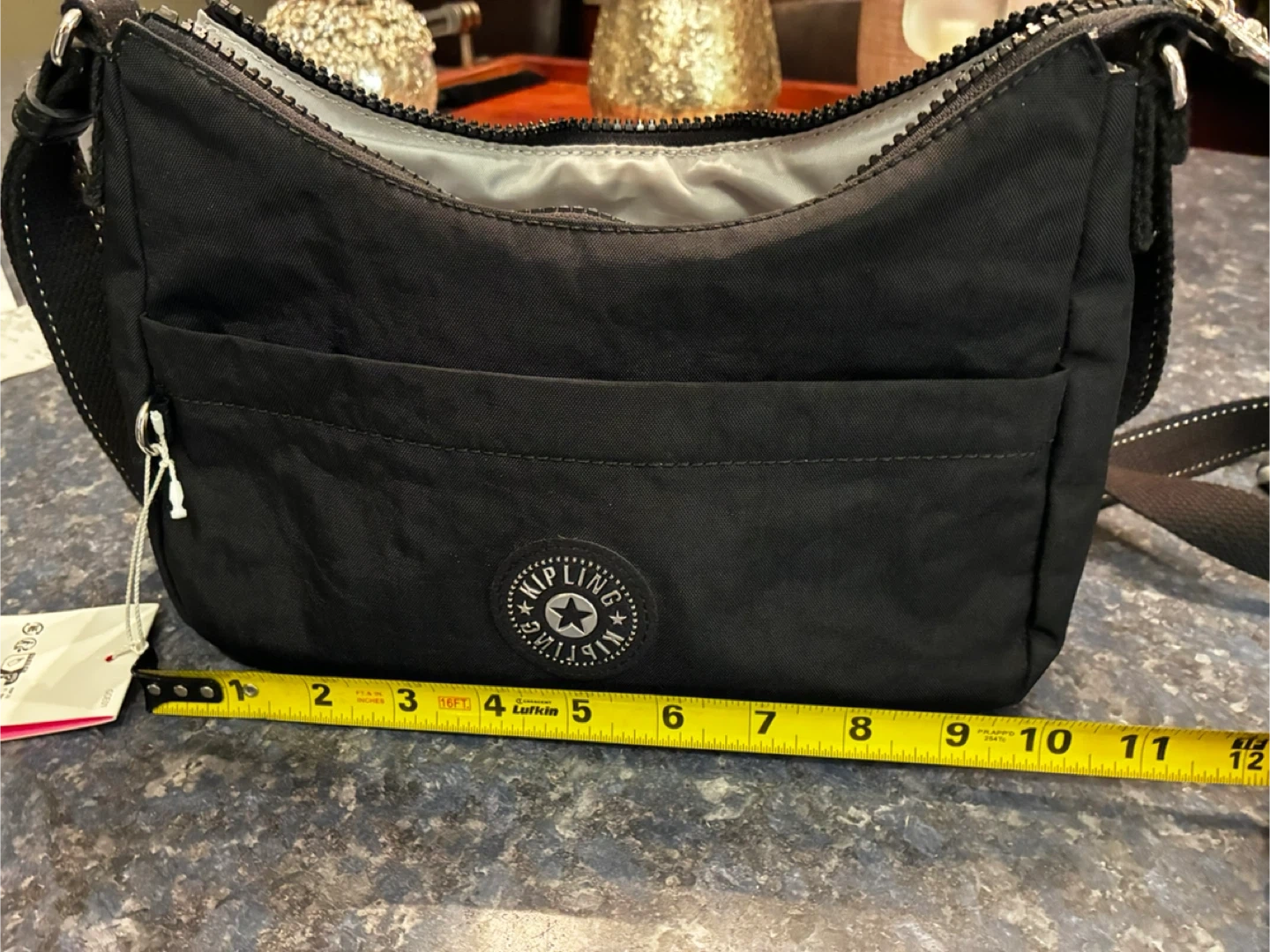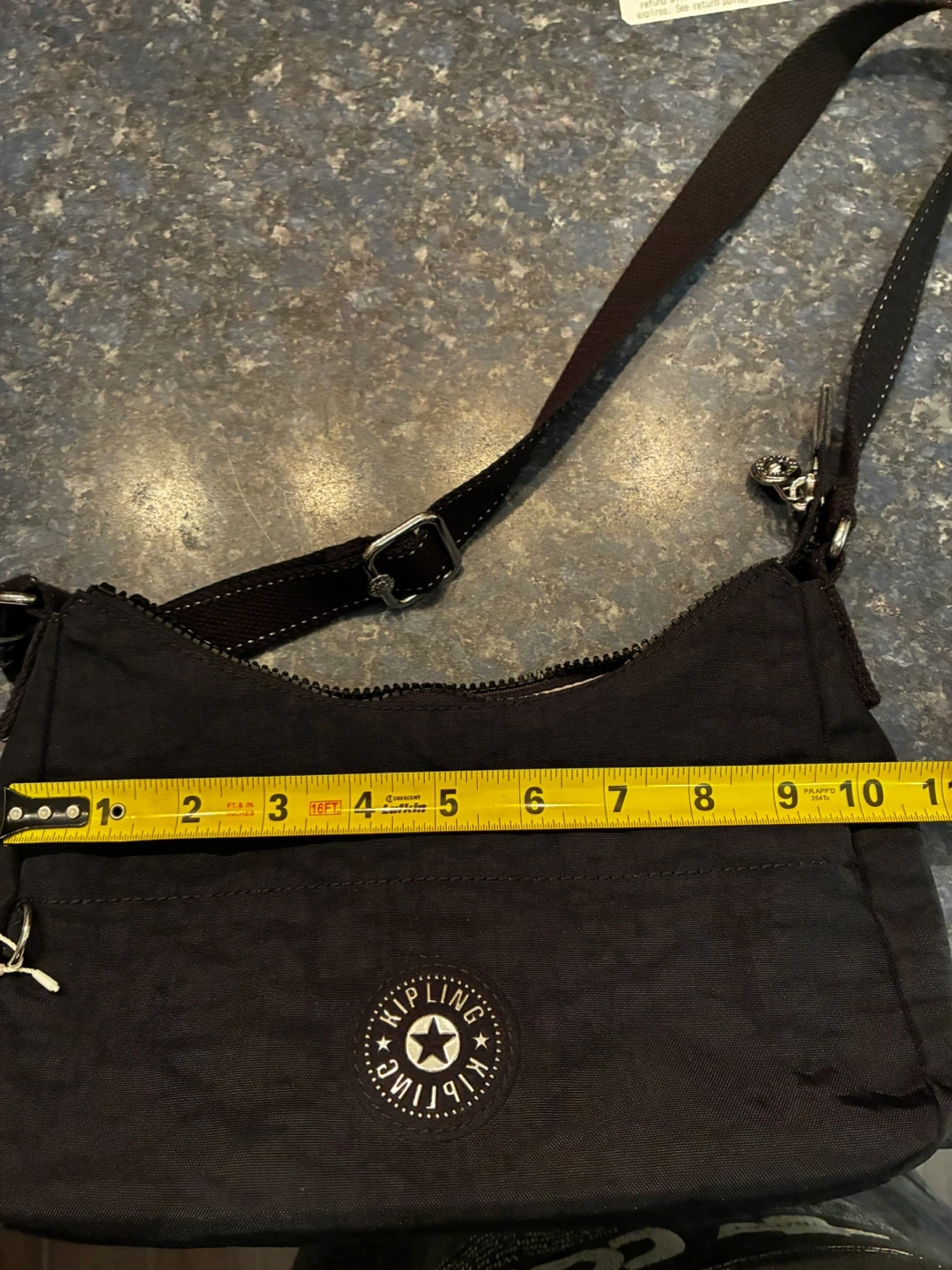 This is a Kipling crossbody bag. It's black and made of nylon. The bag measures approximately 10 inches wide and 5 inches high.