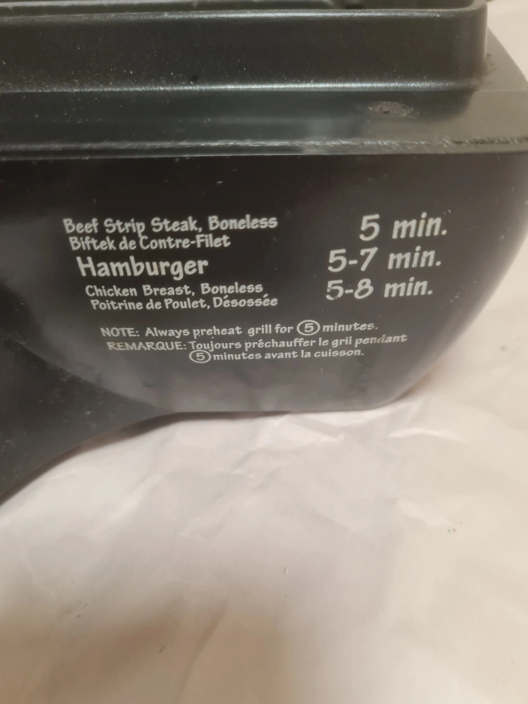 Hamilton Beach electric grill with a built-in timer. It has ribbed cooking plates for searing. Cooking times for beef strip steak, hamburger, and chicken breast are indicated on the unit. Always preheat the grill for 5 minutes before cooking. knob is lost, perfectly working