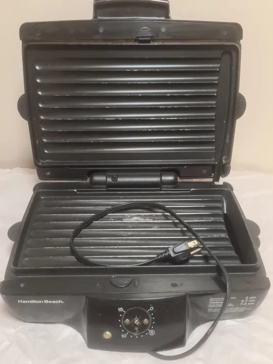 Hamilton Beach electric grill with a built-in timer. It has ribbed cooking plates for searing. Cooking times for beef strip steak, hamburger, and chicken breast are indicated on the unit. Always preheat the grill for 5 minutes before cooking. knob is lost, perfectly working