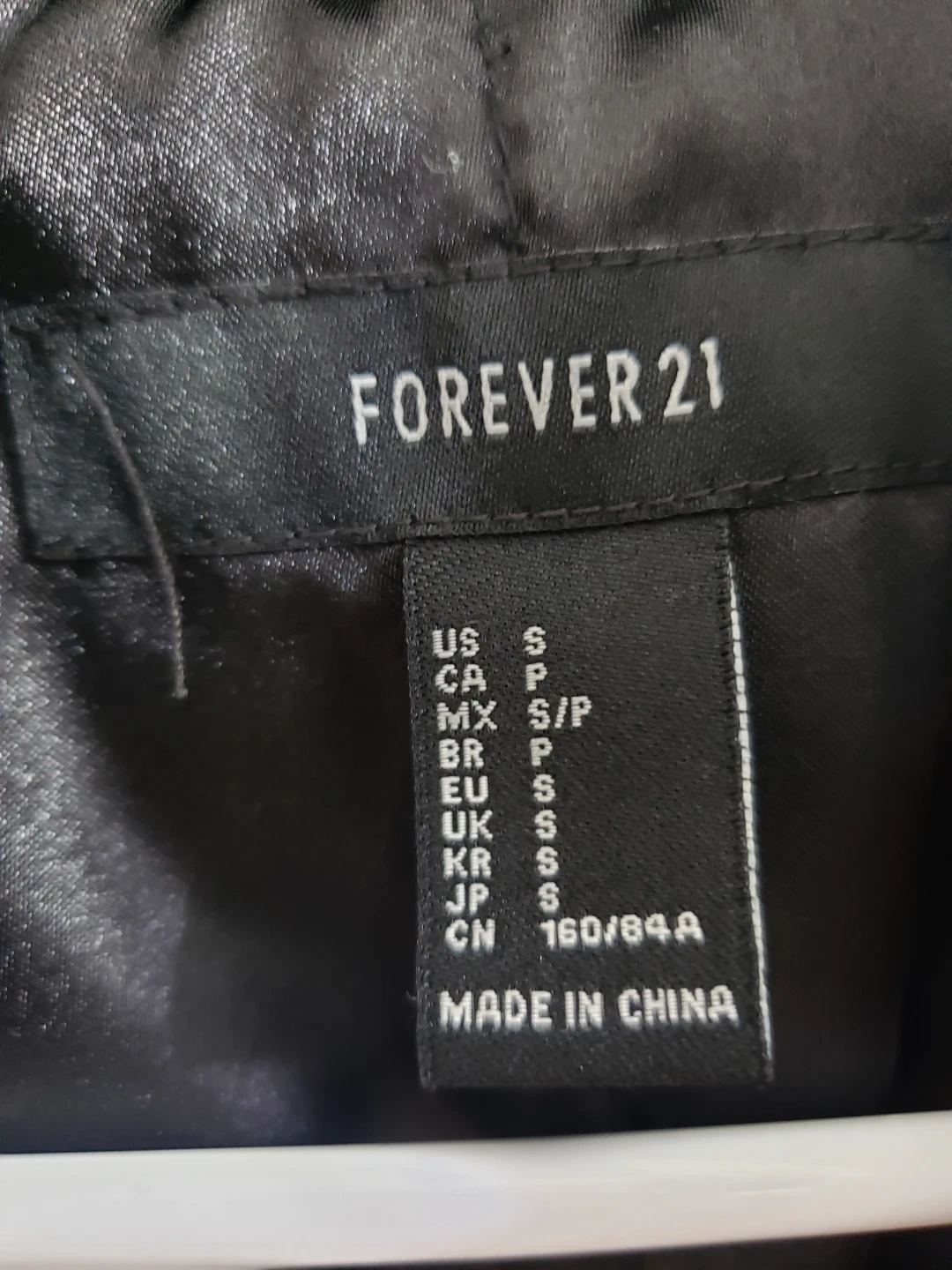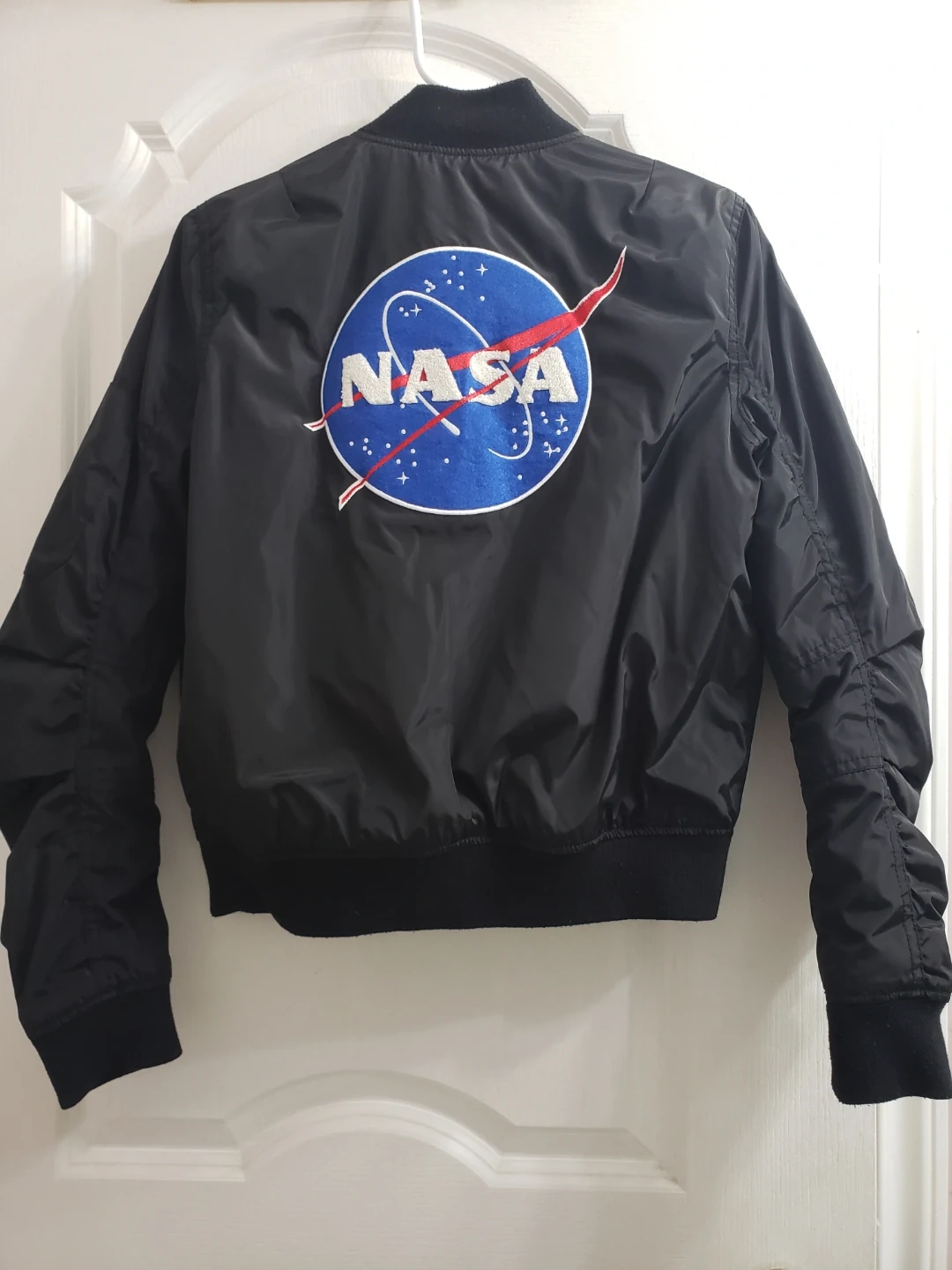 Black bomber jacket from Forever 21 featuring the NASA logo on the front and back. It's a size small with zippered pockets and elastic cuffs. A cool jacket for space enthusiasts!
