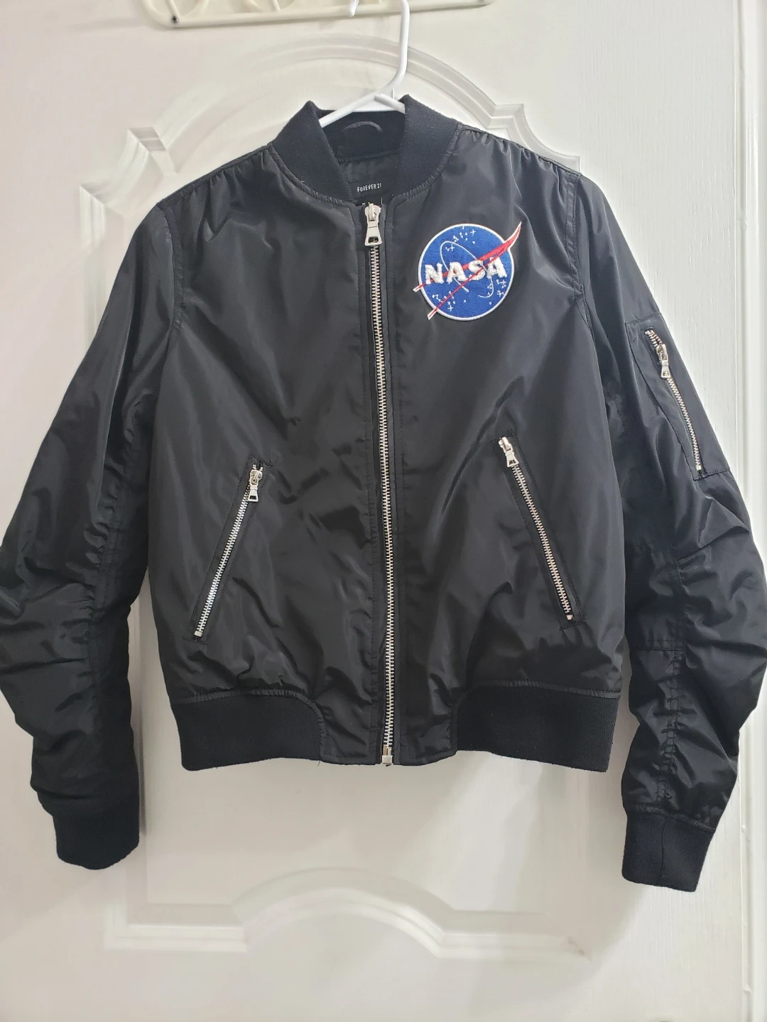 Black bomber jacket from Forever 21 featuring the NASA logo on the front and back. It's a size small with zippered pockets and elastic cuffs. A cool jacket for space enthusiasts!