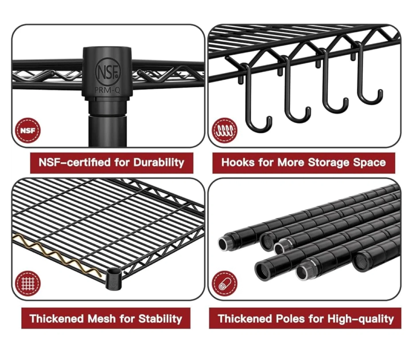 This heavy-duty wire shelving unit is NSF certified for durability and features thickened poles for high quality. It's designed with thickened mesh for stability and comes with hooks for extra storage space. Each shelf has a load capacity of 250 lbs, with a total load capacity of 1250 lbs. This unit is great for organizing kitchens, garages, or workshops.