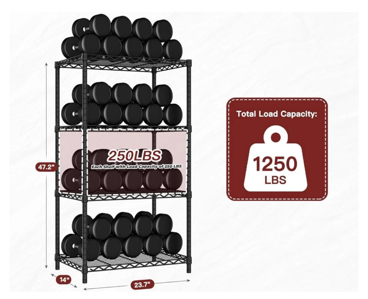 This heavy-duty wire shelving unit is NSF certified for durability and features thickened poles for high quality. It's designed with thickened mesh for stability and comes with hooks for extra storage space. Each shelf has a load capacity of 250 lbs, with a total load capacity of 1250 lbs. This unit is great for organizing kitchens, garages, or workshops.