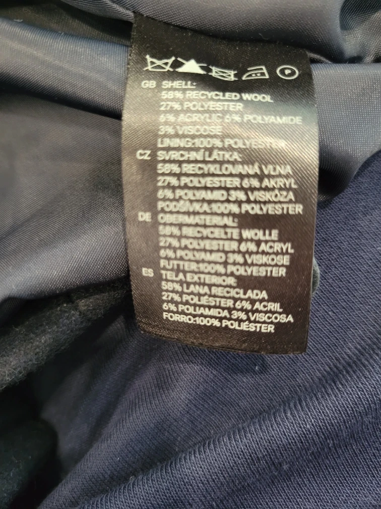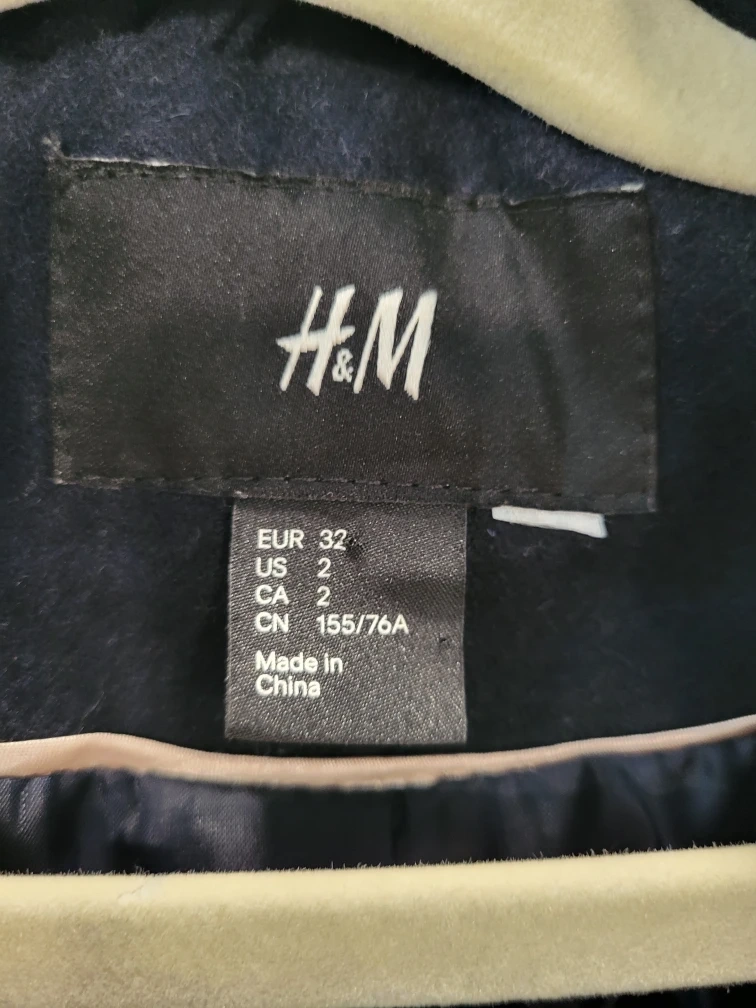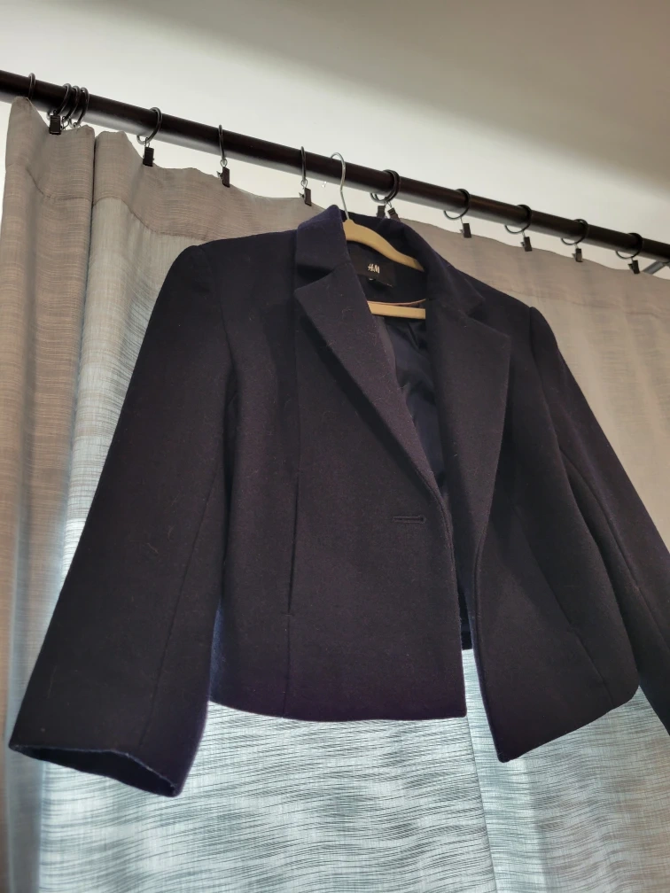 Girls or women's navy cropped blazer jacket from H&M, single button closure. It's made with 58% recycled wool, 27% polyester, 9% acrylic, and 3% polyamide for the shell. A stylish, versatile layering piece.