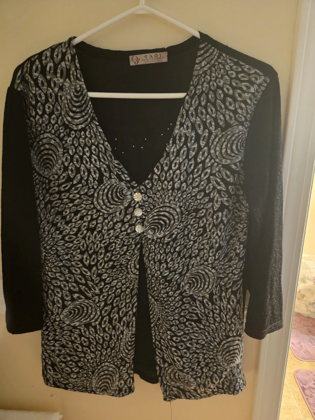 A stylish YAQI COLLECTION women's cardigan. It features a black base with an intricate silver and black abstract pattern on the front. It has a V-neckline and button closures. Great for dressing up an outfit!