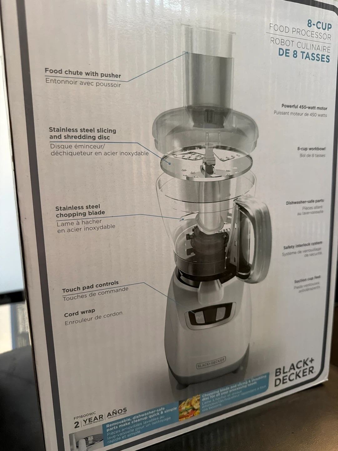 This BLACK+DECKER 8-cup food processor has a powerful 450-watt motor. It includes stainless steel slicing and shredding discs, and a stainless steel chopping blade. The parts are dishwasher-safe for easy cleanup.