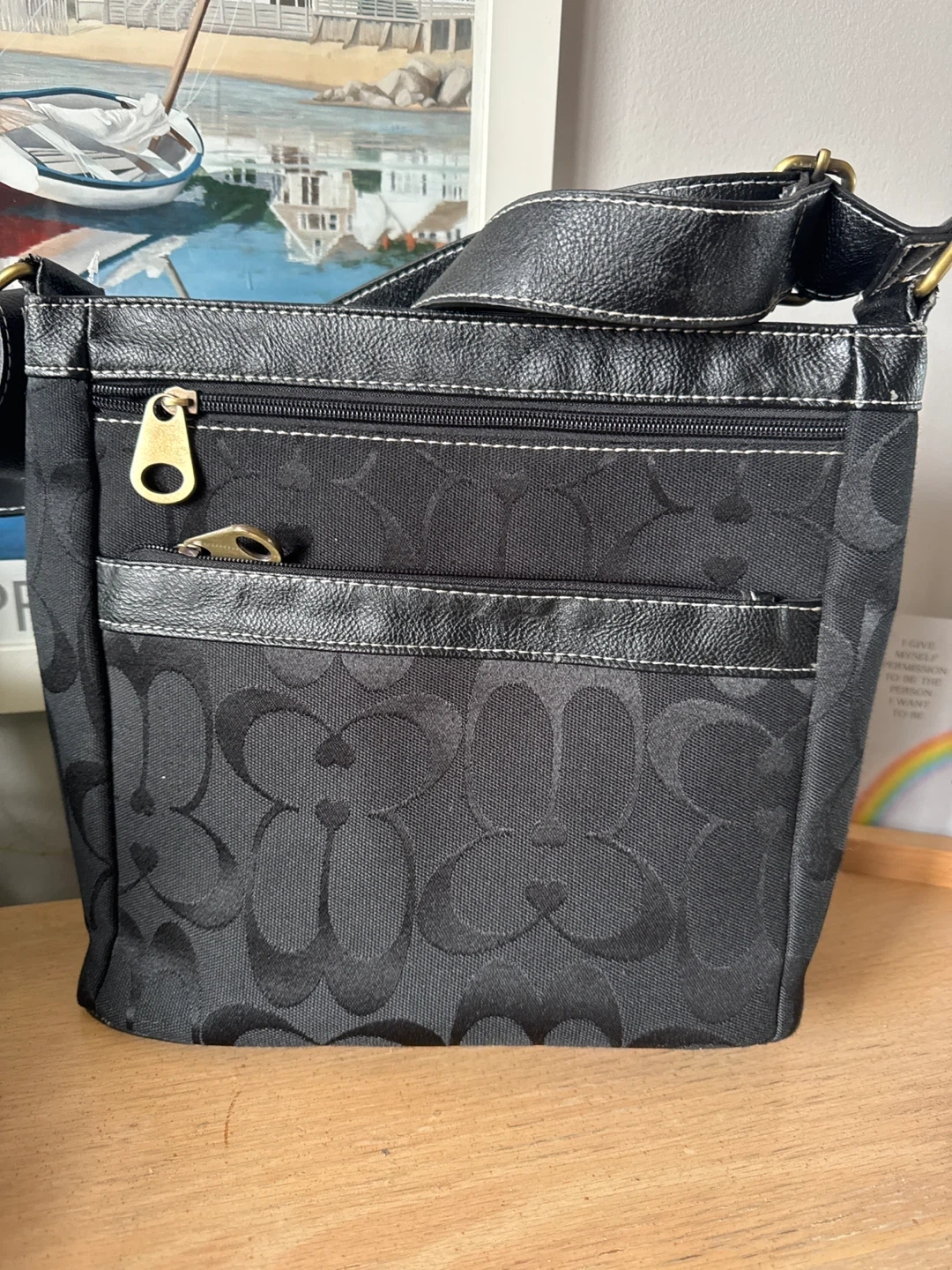 A stylish black crossbody bag featuring the signature monogram pattern. It has multiple zippered pockets for organization and an adjustable strap for comfort. This bag is great for everyday use and carrying essentials.