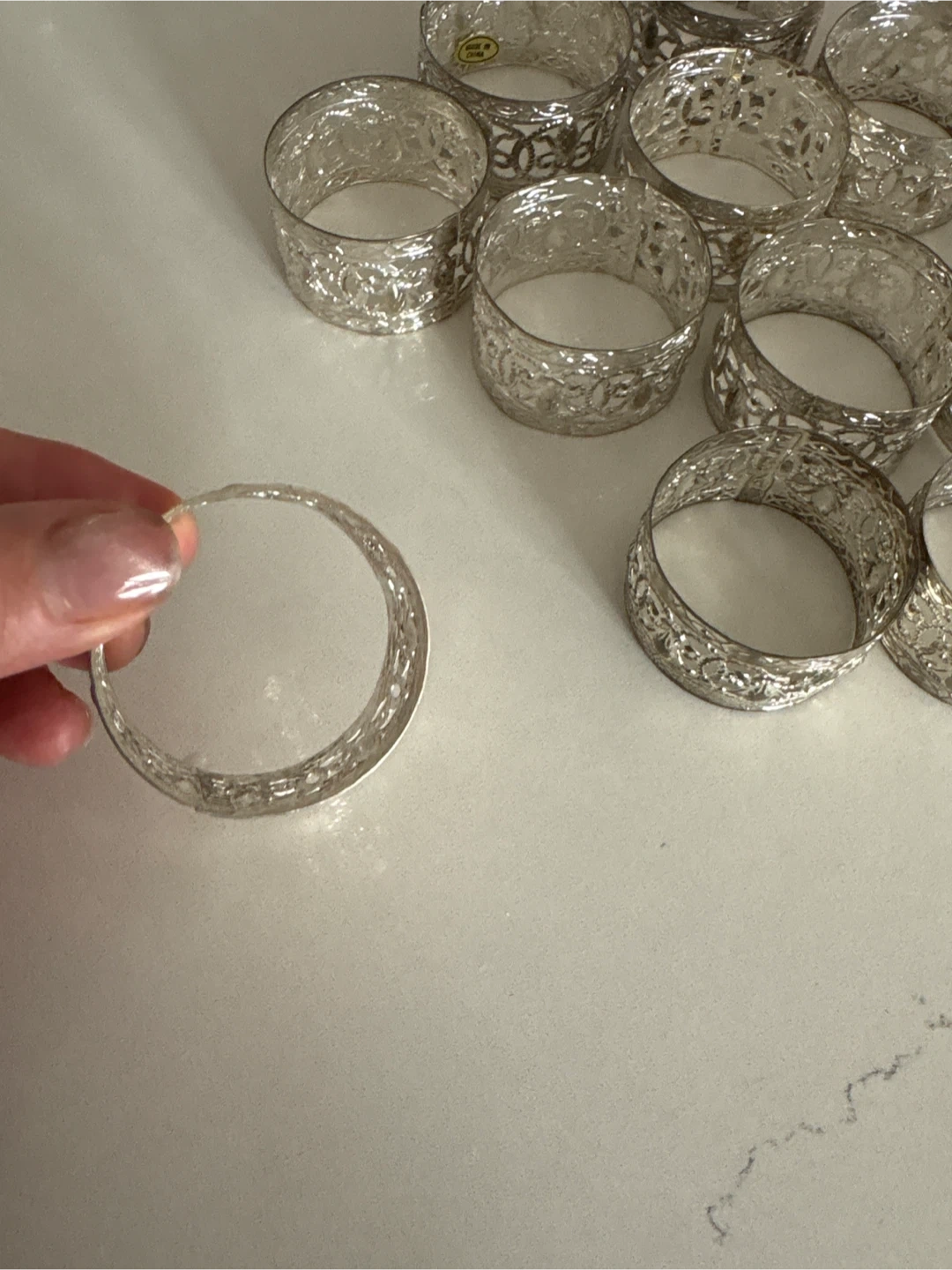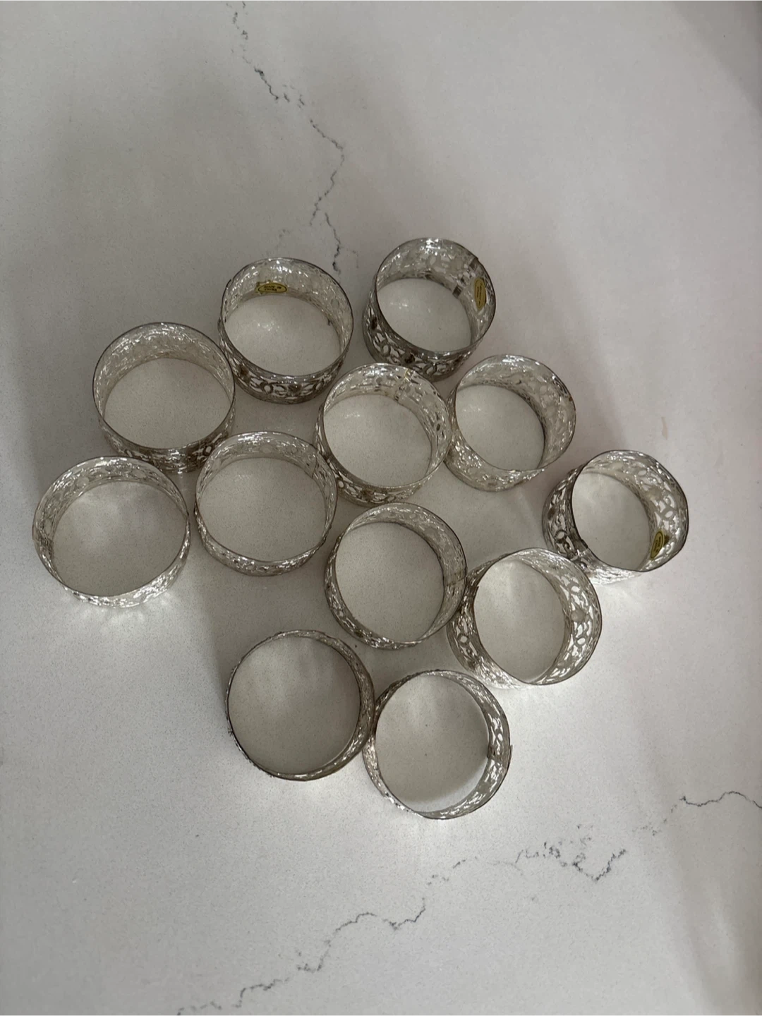 You'll get a set of 12 decorative napkin rings. They're made from a silver-toned metal with an ornate filigree design. These would be lovely for your next dinner party or holiday gathering!