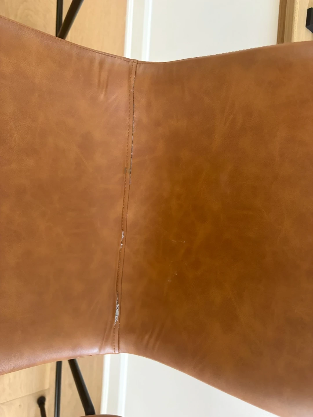 Seven brown faux leather bar stools with black metal legs. These stools have a comfortable seat and back. Perfect for a kitchen island or home bar setup!