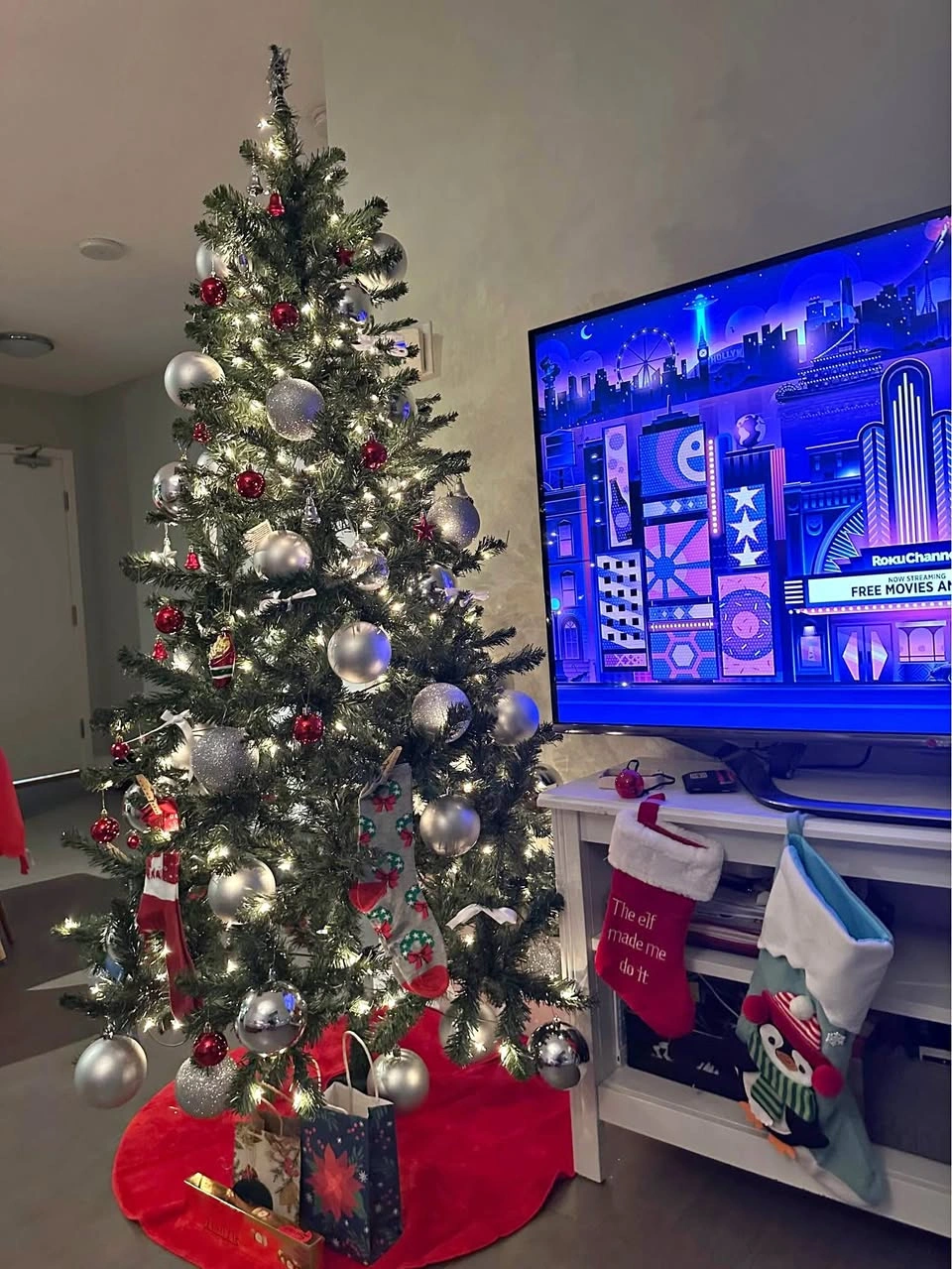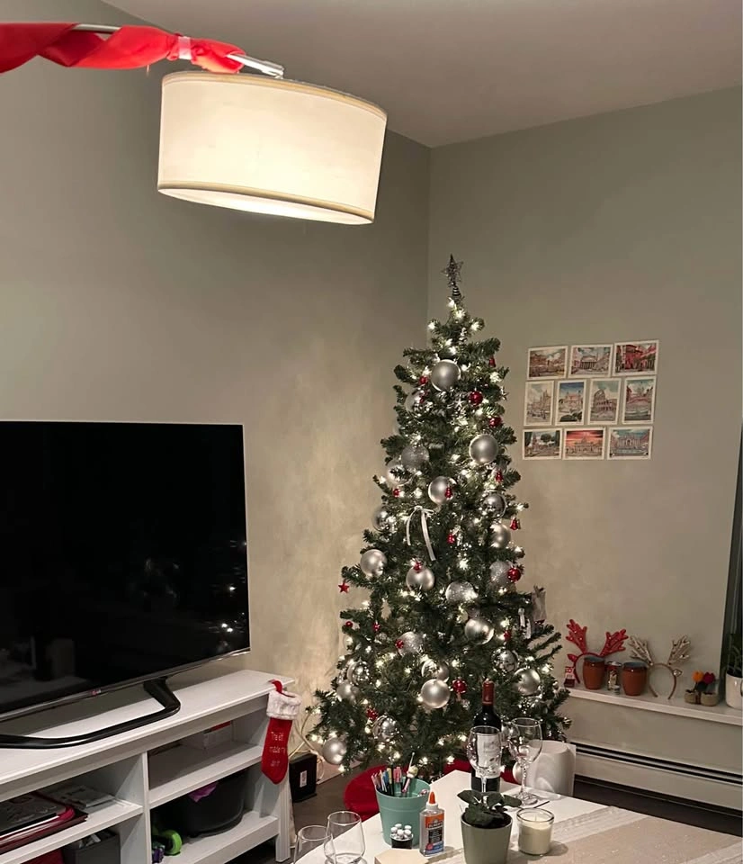 Christmas tree 6.5 foot pre-lit. Selling with silver and red ornaments of different measure and also with the floor skirt. Selling because I am moving. Just bought it last year so is new. I am gifting other small Christmas decoration if interested.