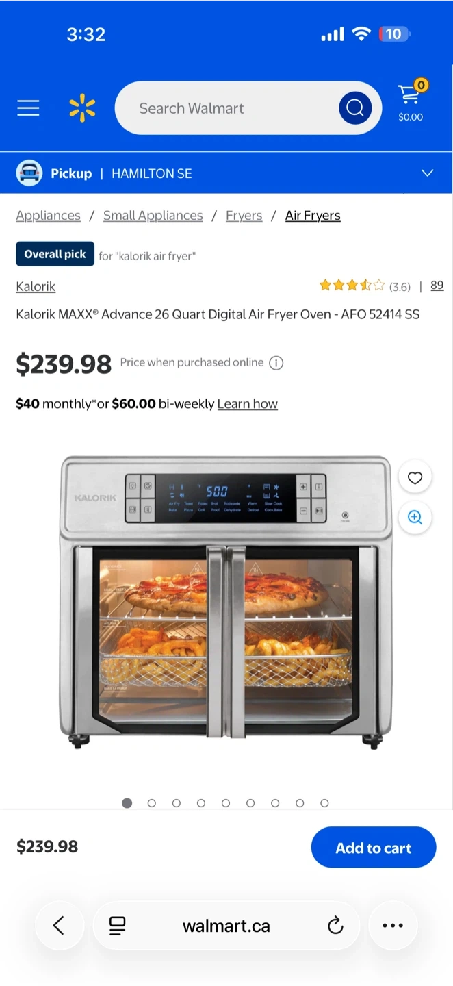 Kalorik MAXX Advance 26 Quart Digital Air Fryer Oven. It's a four-in-one appliance with multiple cooking functions. Features include dual doors and a 26L capacity. Its 238 + tax