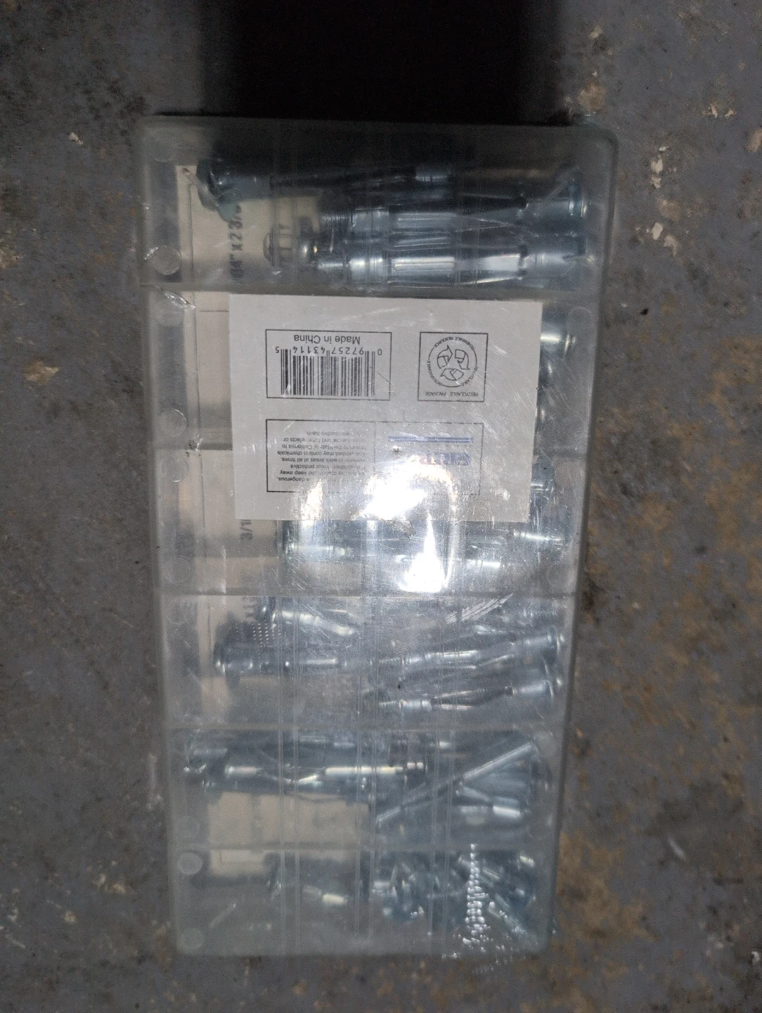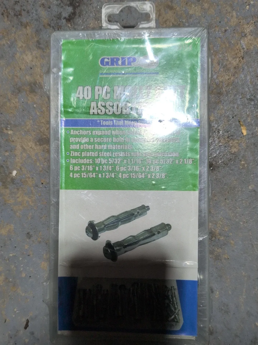 GRIP 40 piece assorted wall anchors. Anchors expand to provide a secure hold. Zinc plated steel resists rust and corrosion. Includes 10 pc 5/32" x 1 1/16", 10 pc 5/32" x 2 1/8", 6 pc 3/16" x 1 3/4", 6 pc 3/16" x 2 3/8", 4 pc 15/64" x 1 3/4", 4 pc 15/64" x 2 3/8".
