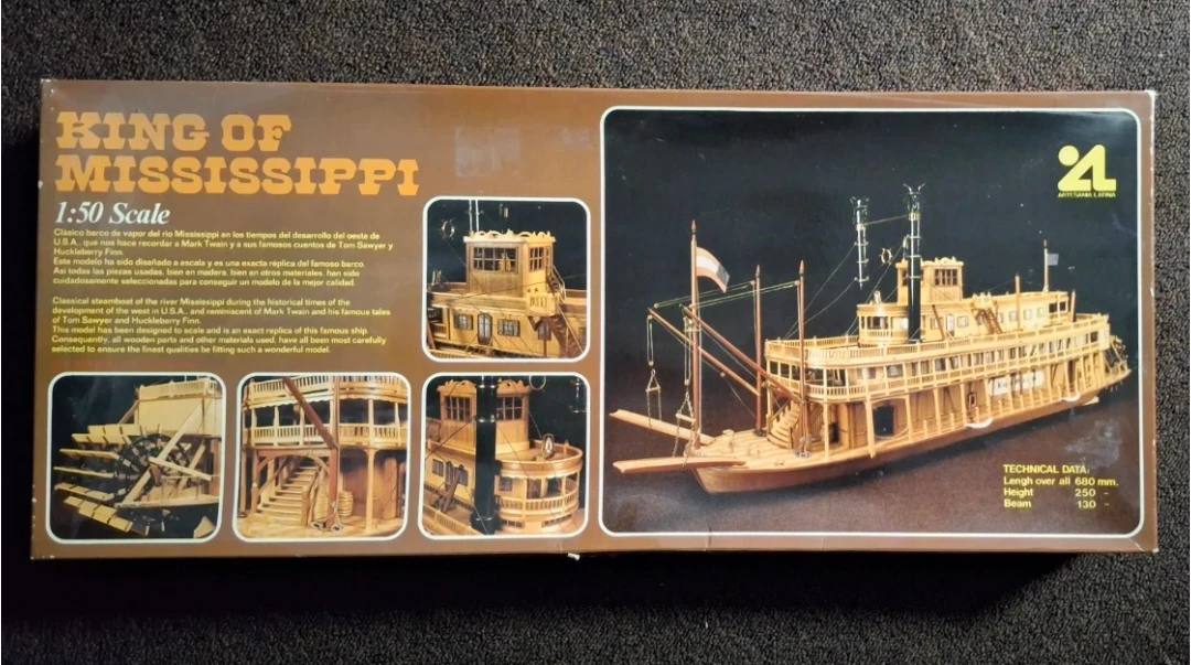 The "King of Mississippi" represents the iconic vessels that moved passengers and goods along the Mississippi River, famously immortalized in the works of Mark Twain. Key Features: ​The Paddle Wheel: This is the centerpiece. In the kit, it's usually designed to be functional. ​Multi-Deck Construction:l ​Ornate Detailing: The kit includes tiny railings, chimneys (smokestacks), and the pilot house, which give it that authentic Southern gothic aesthetic .Scale: 1:50 ​Length: Over 680 mm (approx. 26.7 inches) ​Height: 250 mm ​Beam (Width): 130 mm ​ Brand new. Open box.