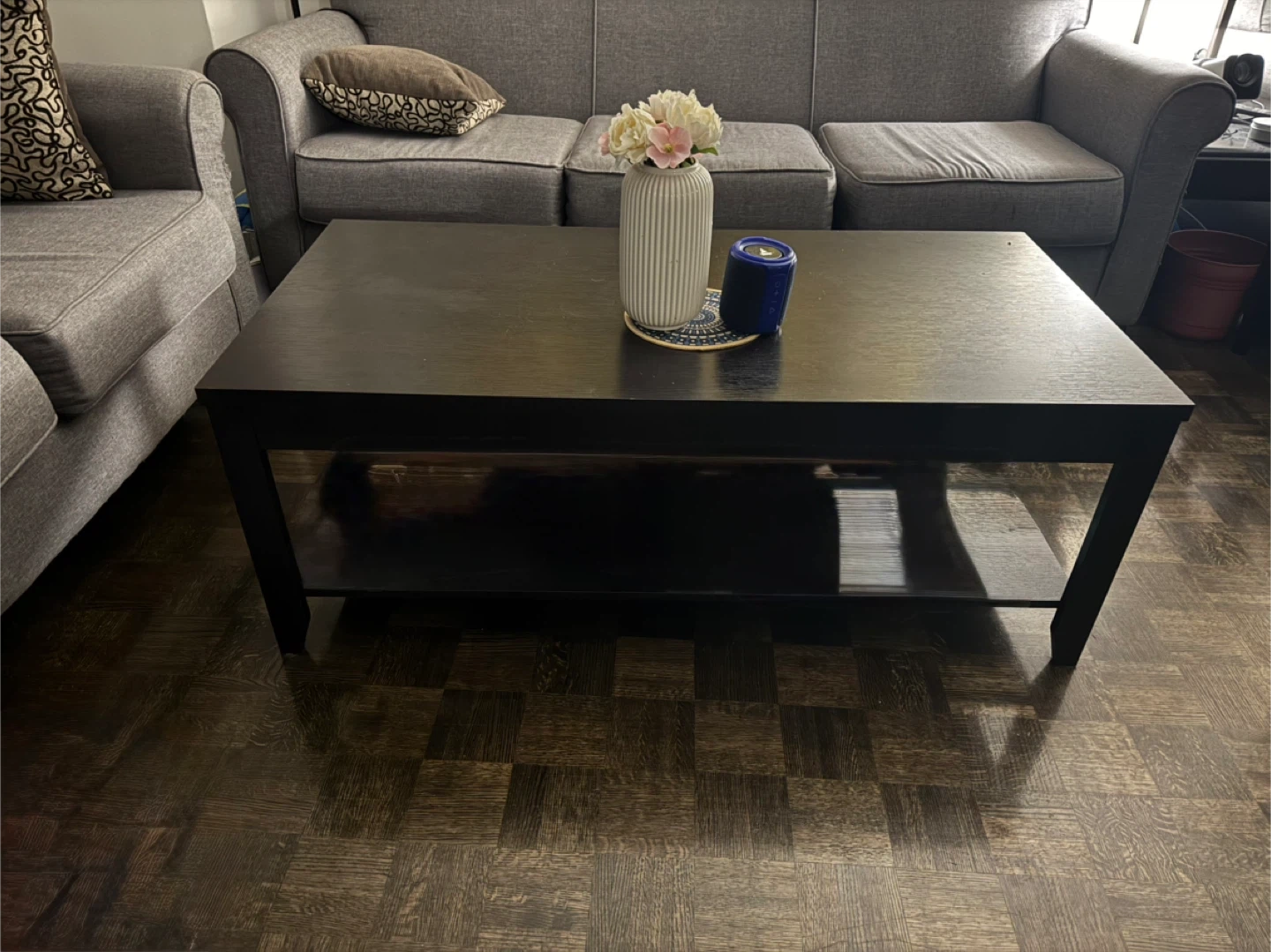 Selling a coffee table in good condition. It's a sleek dark brown colour and has a handy shelf at the bottom for storage or decor. Perfect for any living room!