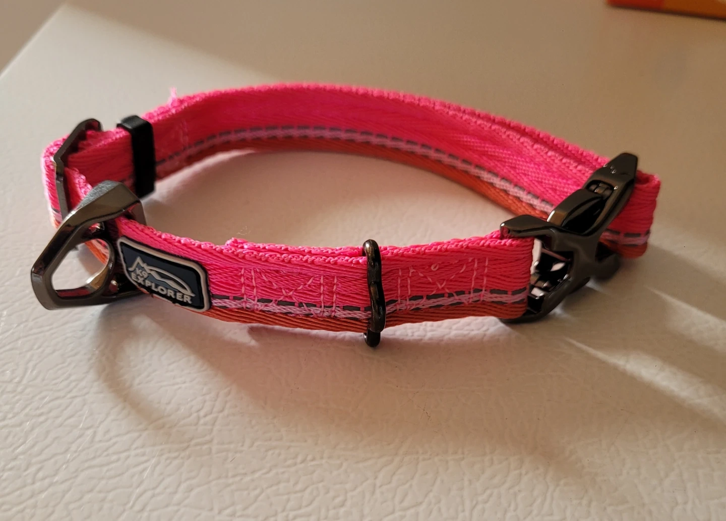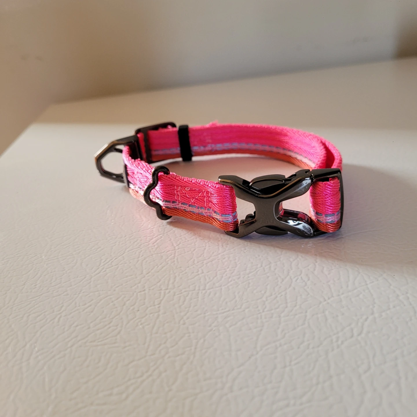 New Pink Dog Collar. Measures from 12 to 17 inches. The clasps are all metal and the collar is heavy. Too big for my dog. I did try it on her.