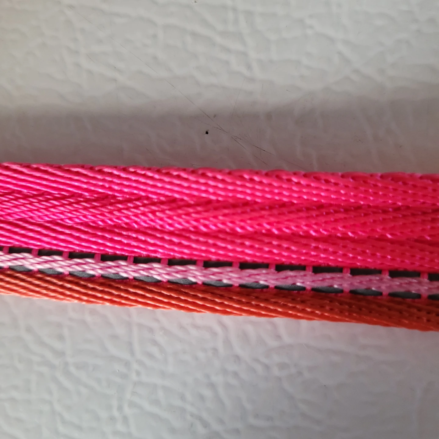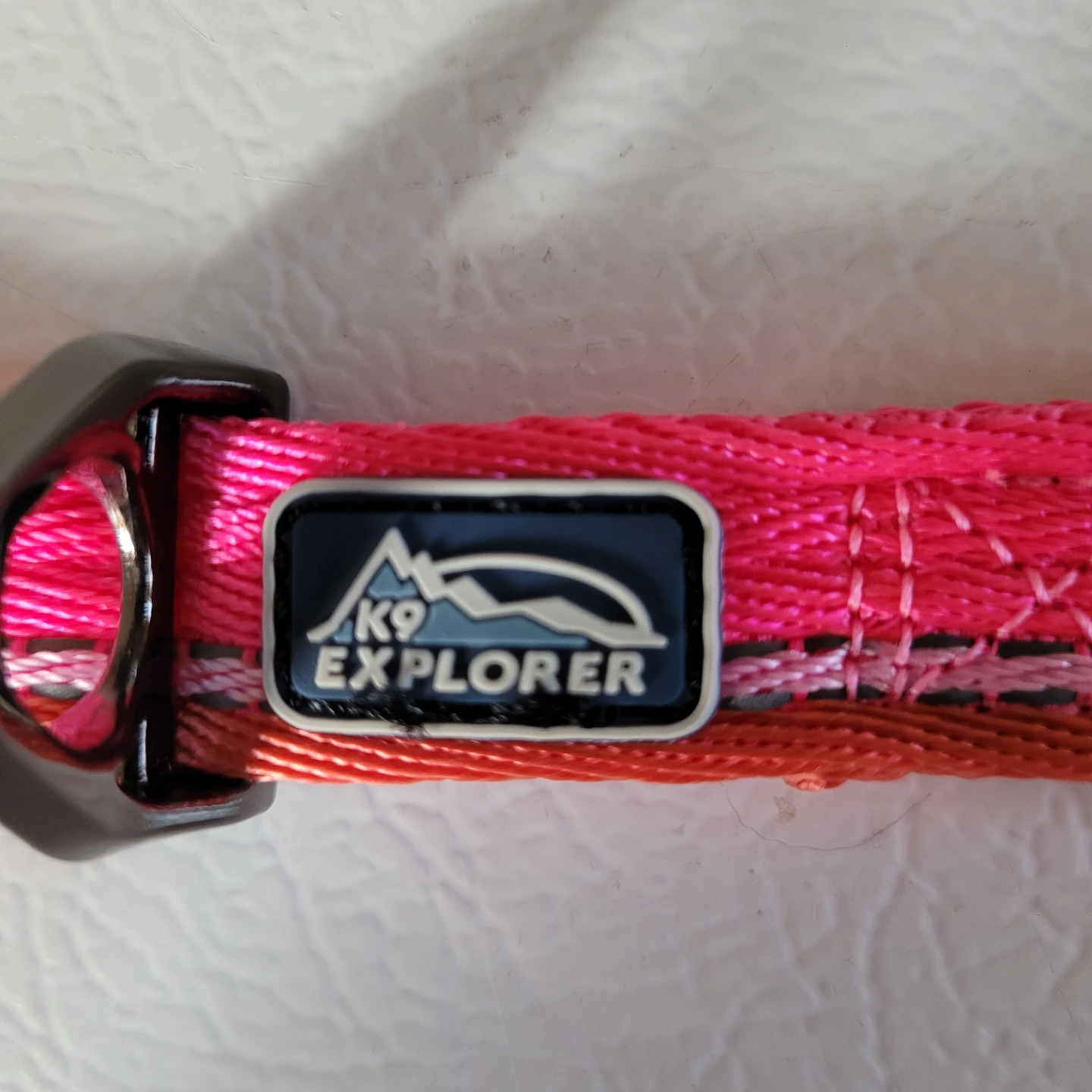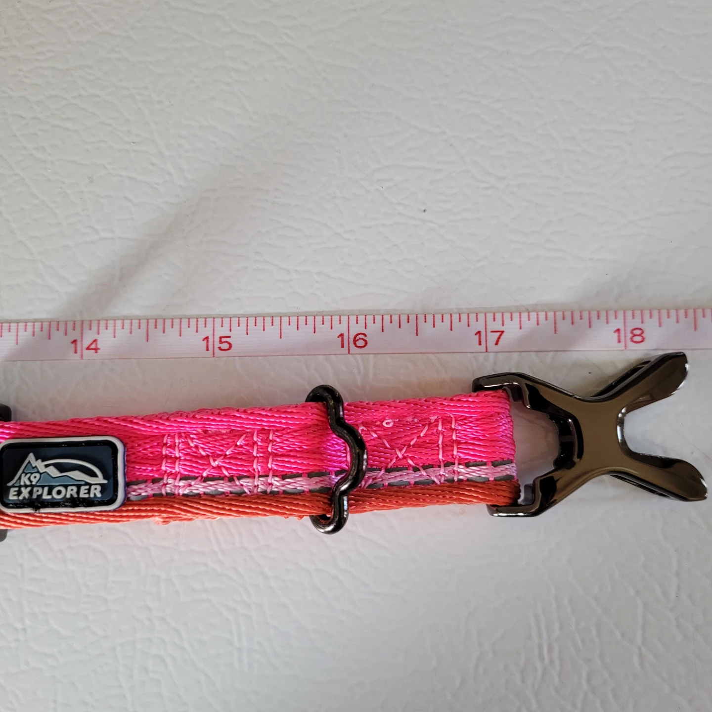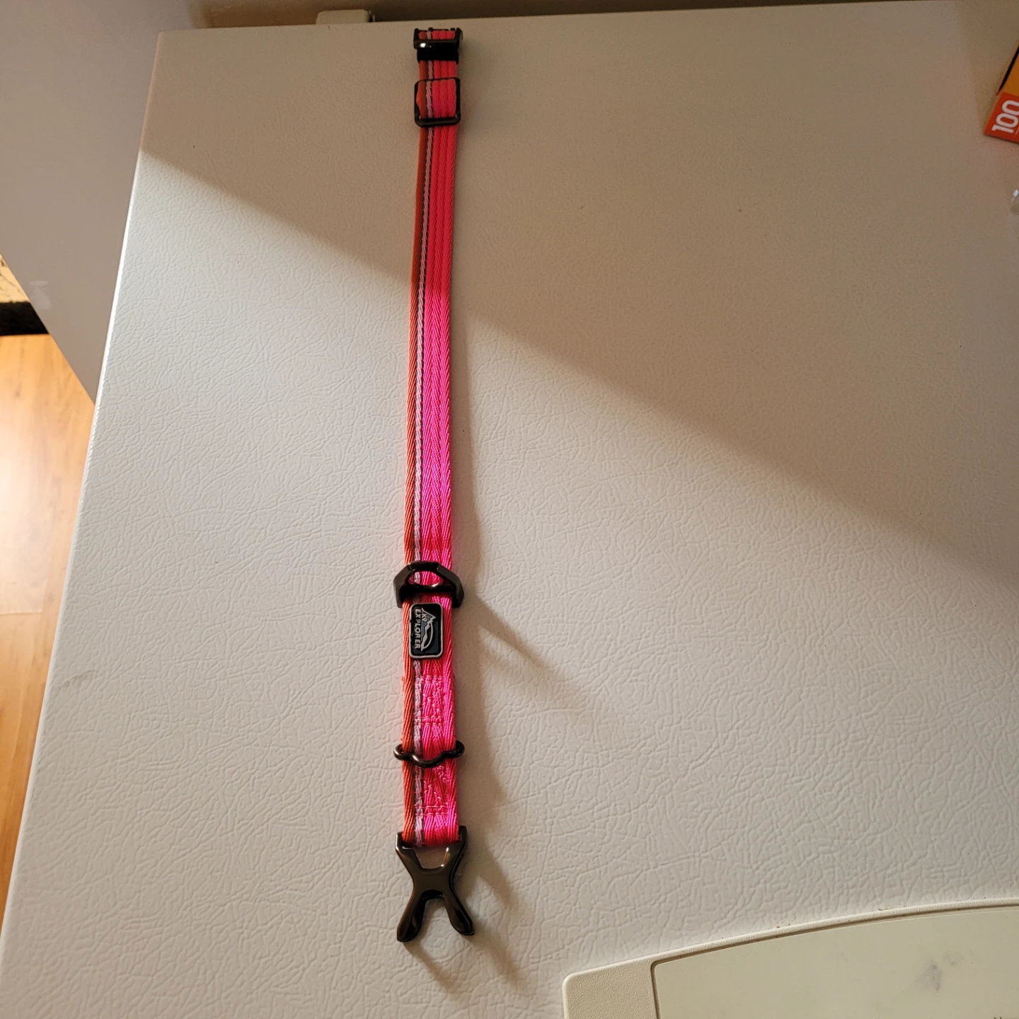 New Pink Dog Collar. Measures from 12 to 17 inches. The clasps are all metal and the collar is heavy. Too big for my dog. I did try it on her.