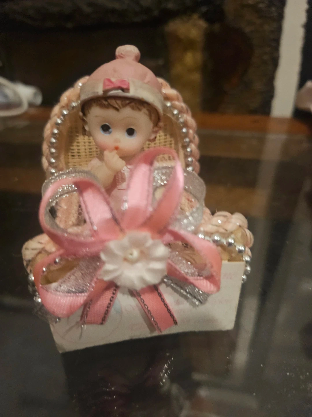 This is a sweet little figurine of a baby in a decorative basket. It's adorned with pink and silver ribbons and a small white flower. It's a cute decorative piece.