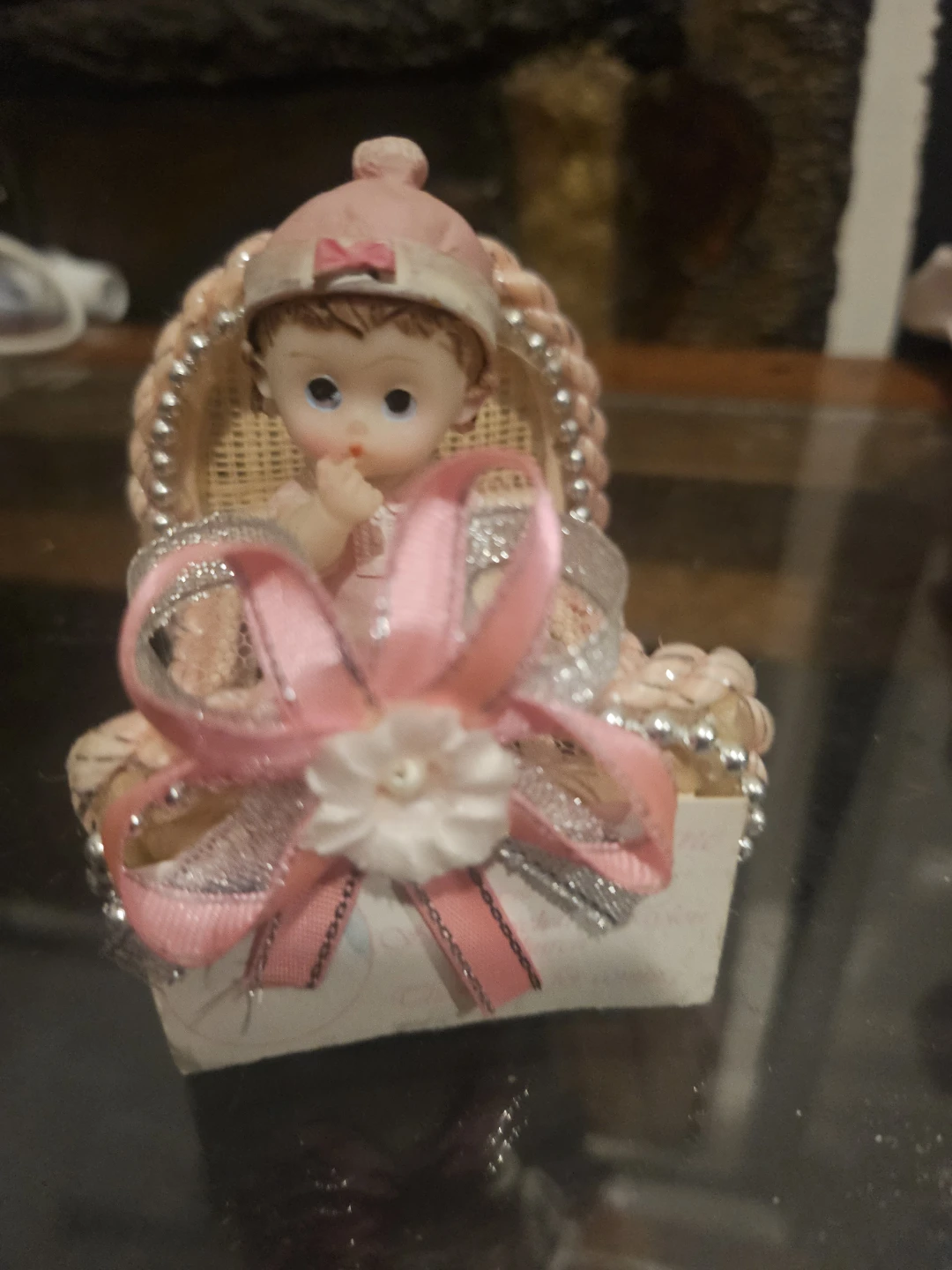This is a sweet little figurine of a baby in a decorative basket. It's adorned with pink and silver ribbons and a small white flower. It's a cute decorative piece.