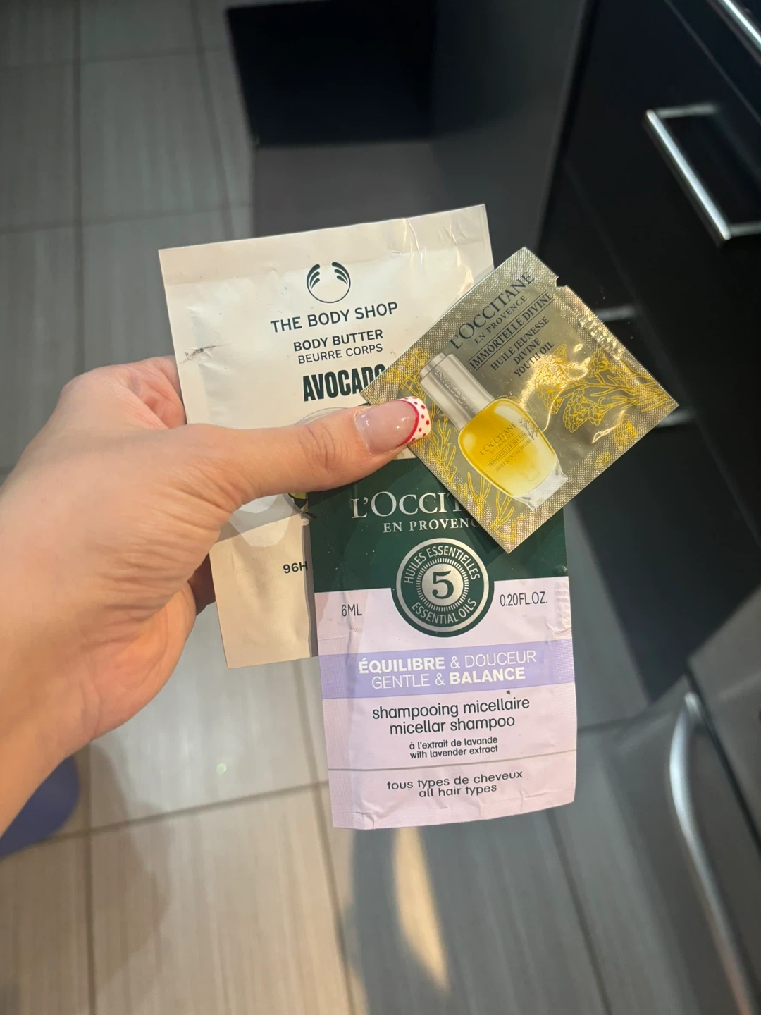 Includes The Body Shop Avocado Body Butter, L'Occitane Immortelle Divine Youth Oil, and L'Occitane Gentle & Balance Micellar Shampoo. Shampoo is 6ML/0.20FL.OZ. and suitable for all hair types. Body butter is indicated for 96H hydration.