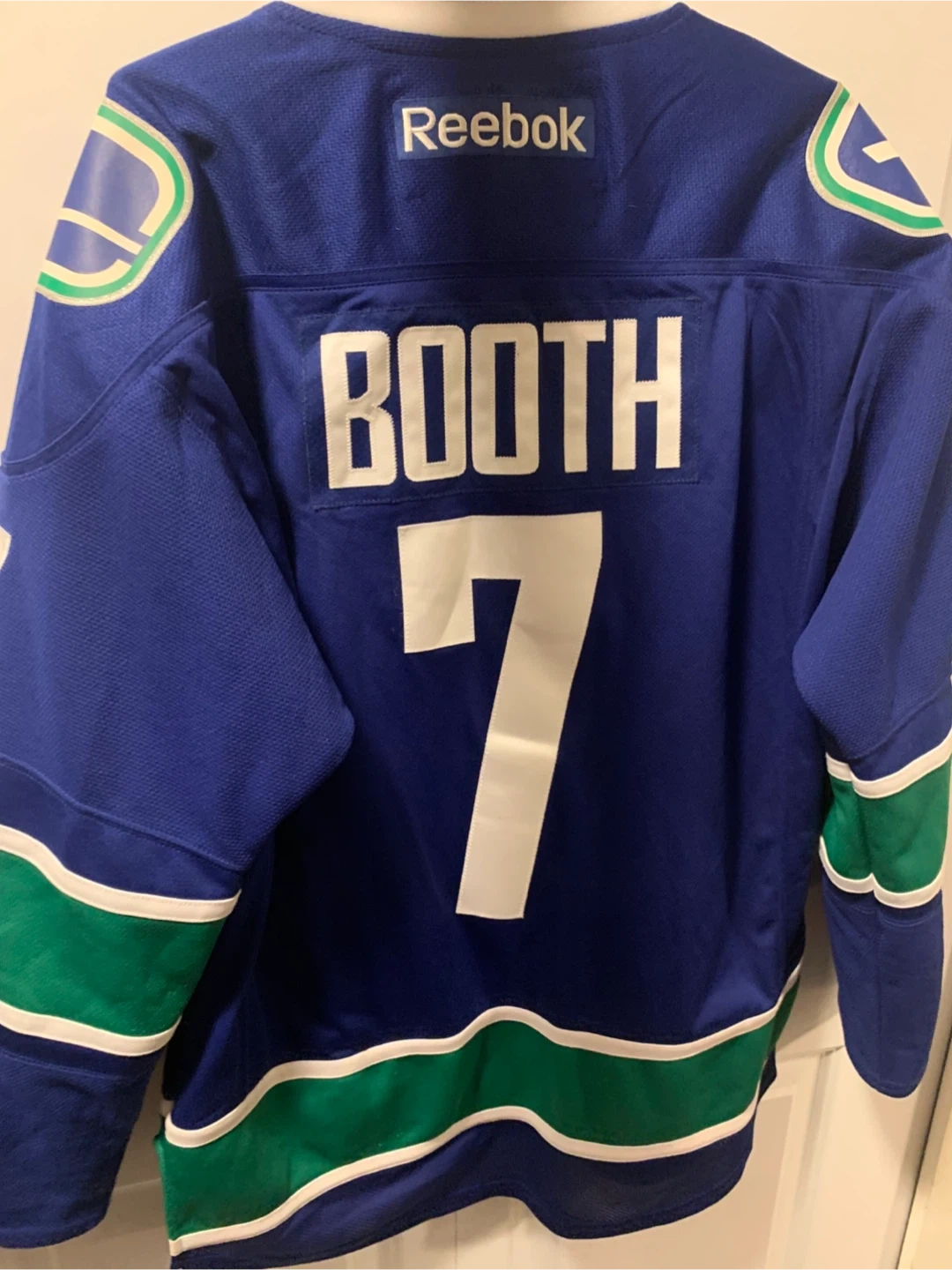 Selling a Reebok Vancouver Canucks jersey with Booth and number 7 on the back. This jersey is a men's size medium and is in used condition. It's a fantastic piece for any Canucks fan looking to show their support! This hockey jersey would be perfect for wearing to games or displaying as a collector's item.