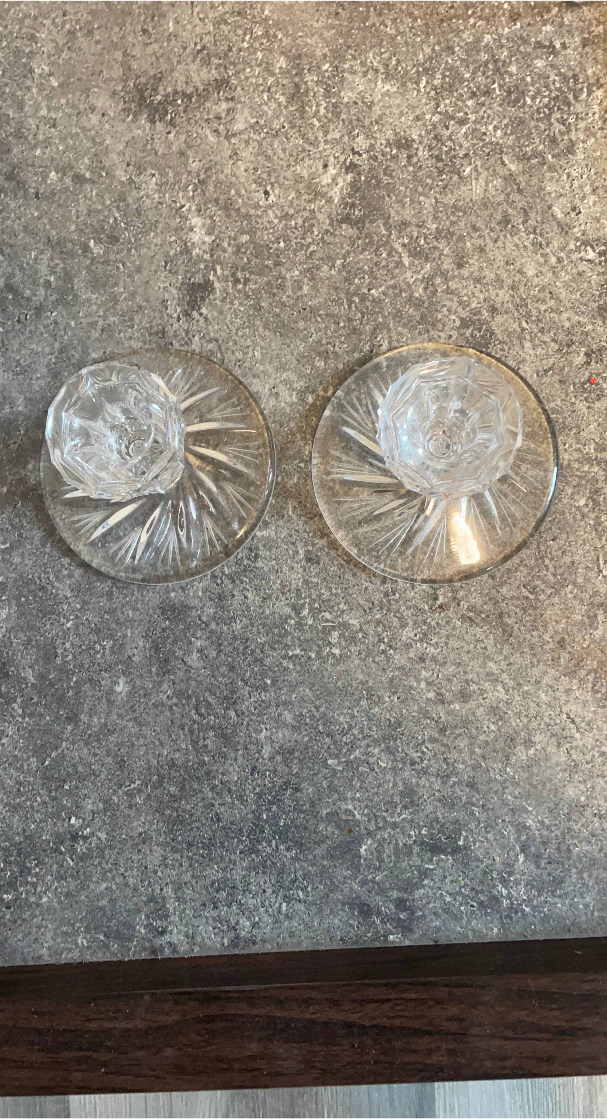 Two beautiful clear crystal votive candle holders. Each features a starburst pattern on the base and a faceted cup for the candle. They're great for adding a touch of elegance to any table setting. Glass material.
