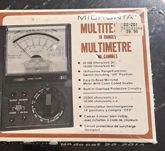 This is a Micronta multimeter with 18 ranges. It features 20,000 Ohms/Volt DC and 10,000 Ohms/Volt AC capabilities. The multimeter has a 14-position range/function switch, an easy-to-read mirrored meter with colour-coded scales, and built-in overload protective circuitry.