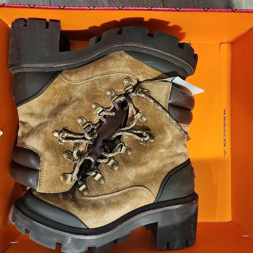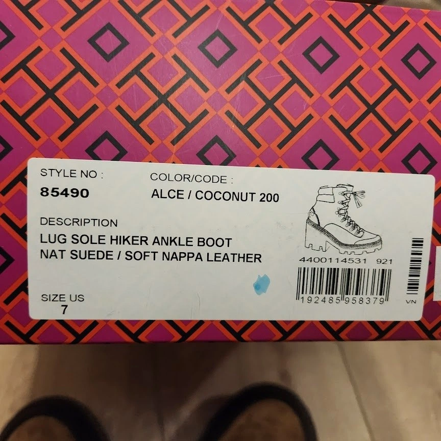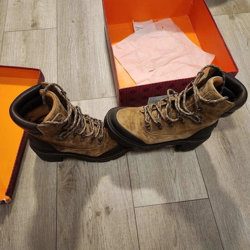 Brand new, never used. NEW Tory Burch Lug Sole Hiker Ankle Boot in Natural Suede and soft Nappa leather, Size 7. Style No 85490. Pickup near North Burnaby Secondary School. Cash preferred.