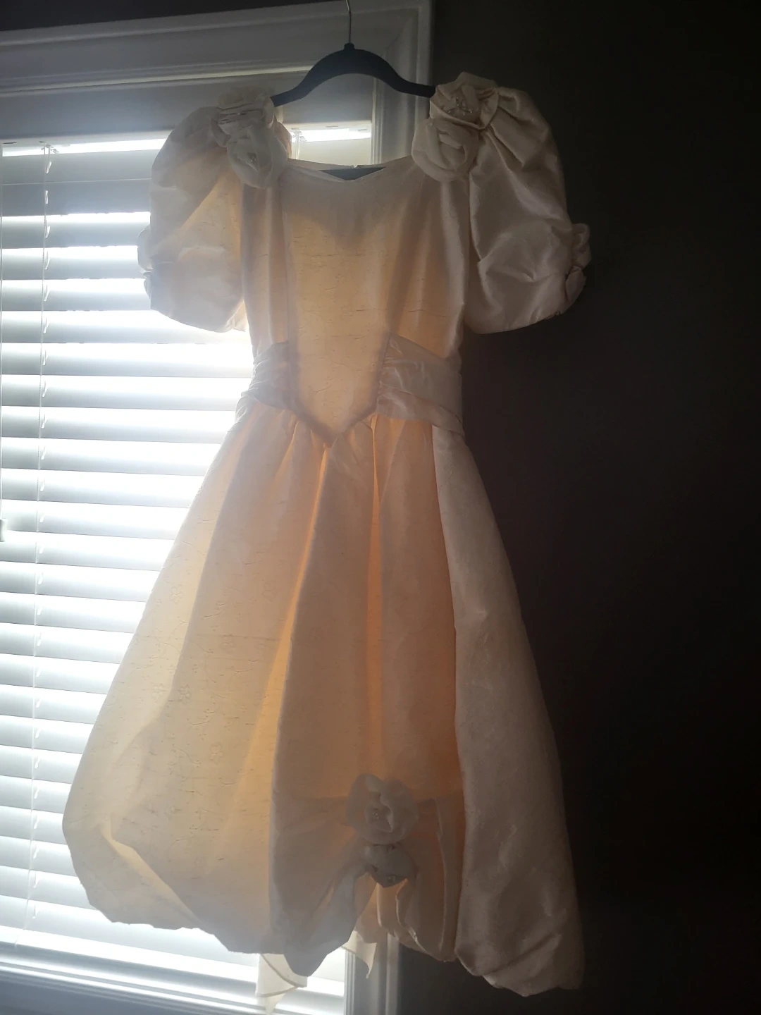 Cream-coloured dress with puffed sleeves and a decorative flower at the hem. Features a satiny sheen and a ruched waistband. It's a special occasion dress!
