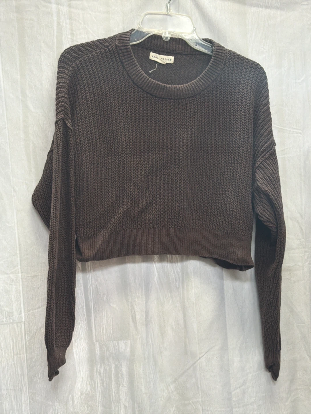 This Aeropostale sweater features a rich brown color and a comfortable knit texture. It's a cropped style with long sleeves. This sweater is made of a soft material.