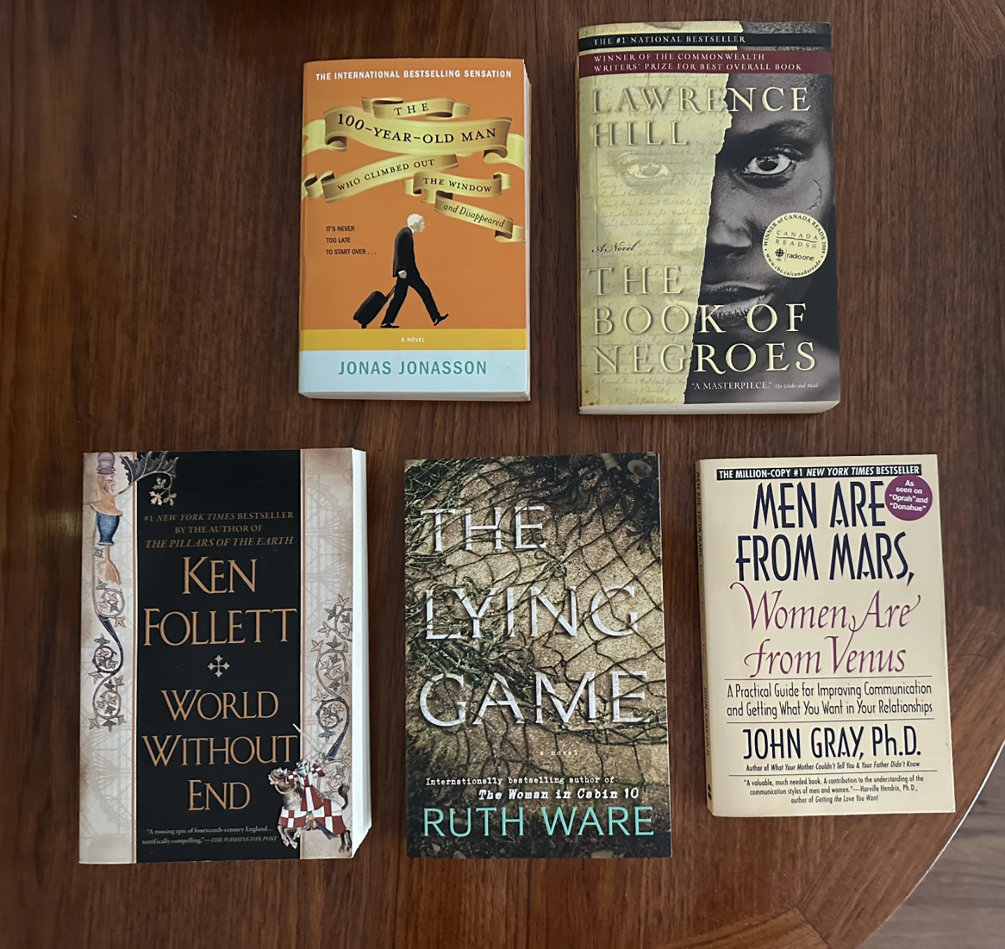 This lot includes five popular novels. Titles are 'The 100-Year-Old Man Who Climbed Out the Window and Disappeared' by Jonas Jonasson, 'The Book of Negroes' by Lawrence Hill, 'World Without End' by Ken Follett, 'The Lying Game' by Ruth Ware, and 'Men Are from Mars, Women Are from Venus' by John Gray Ph.D.