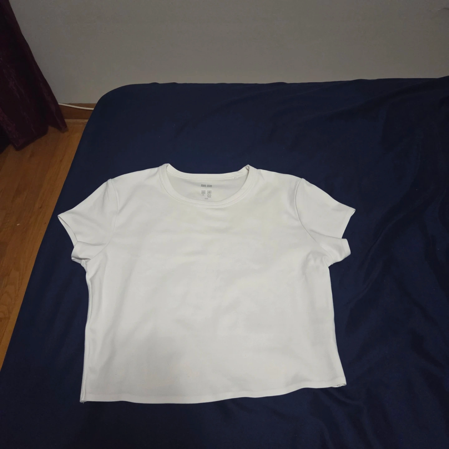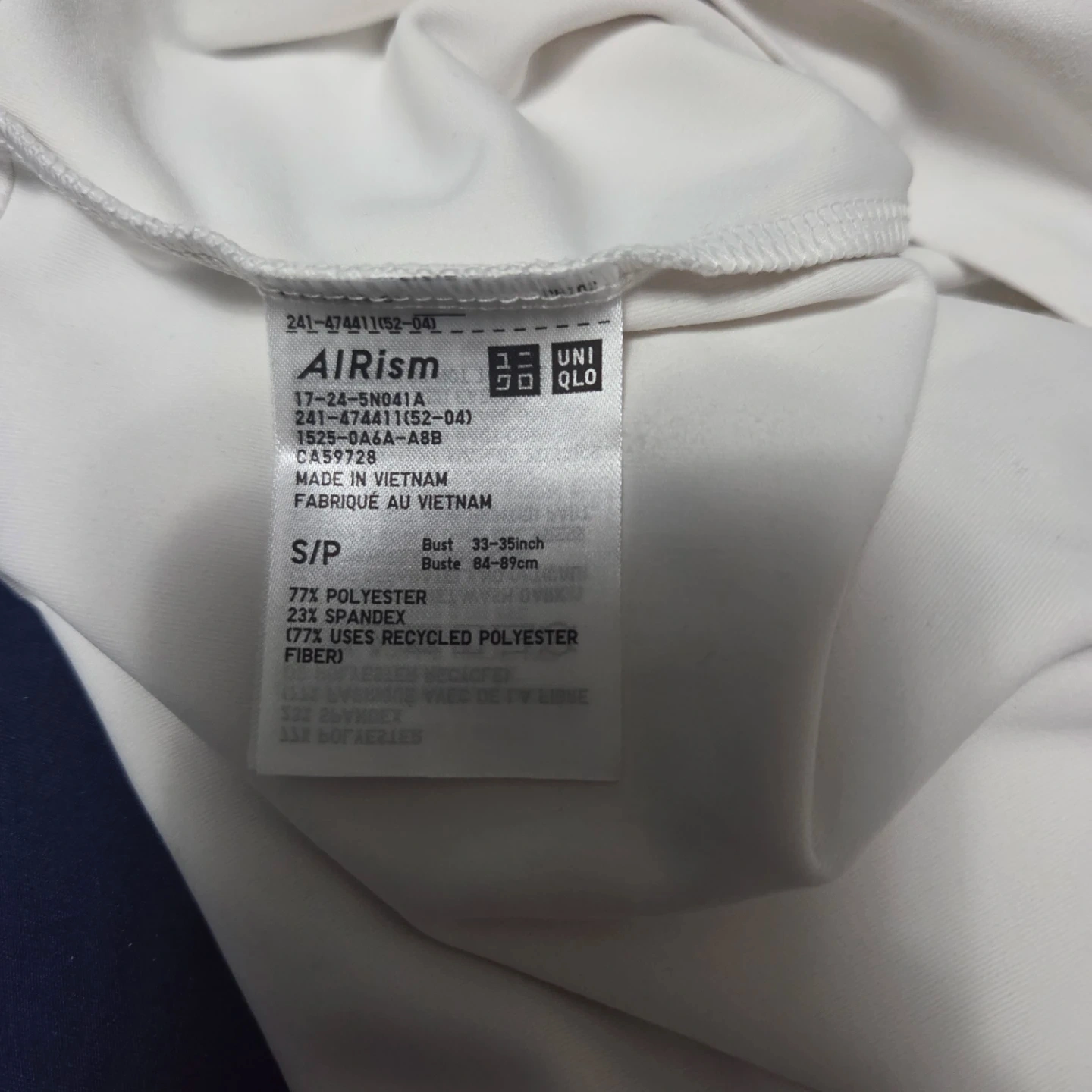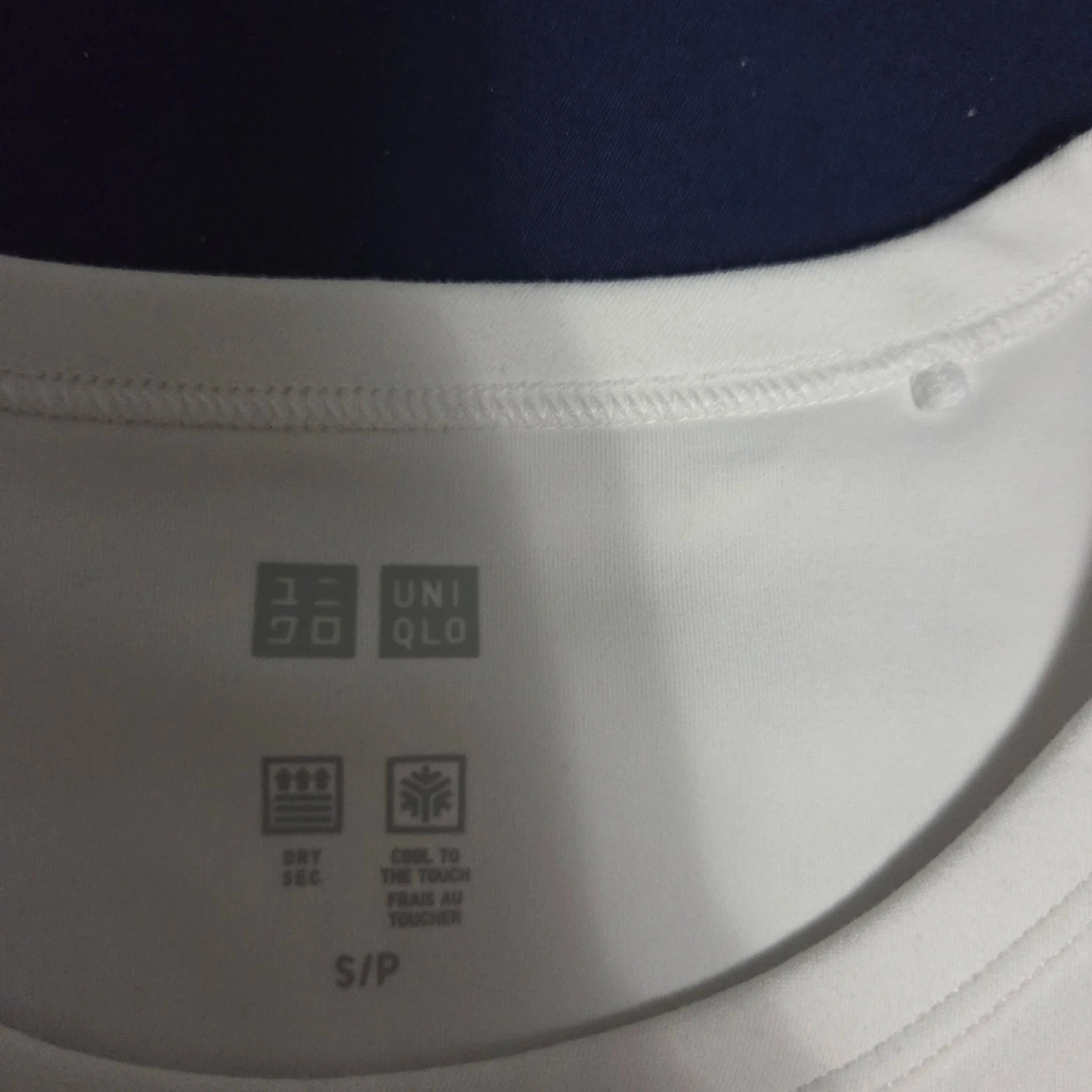 This UNIQLO AIRism t-shirt is white and size S/P. It's made with 77% polyester and 23% spandex, and uses recycled polyester fiber. It's designed to be dry and cool to the touch.