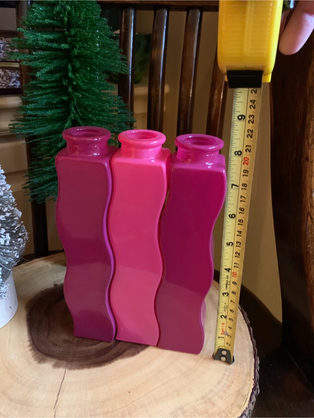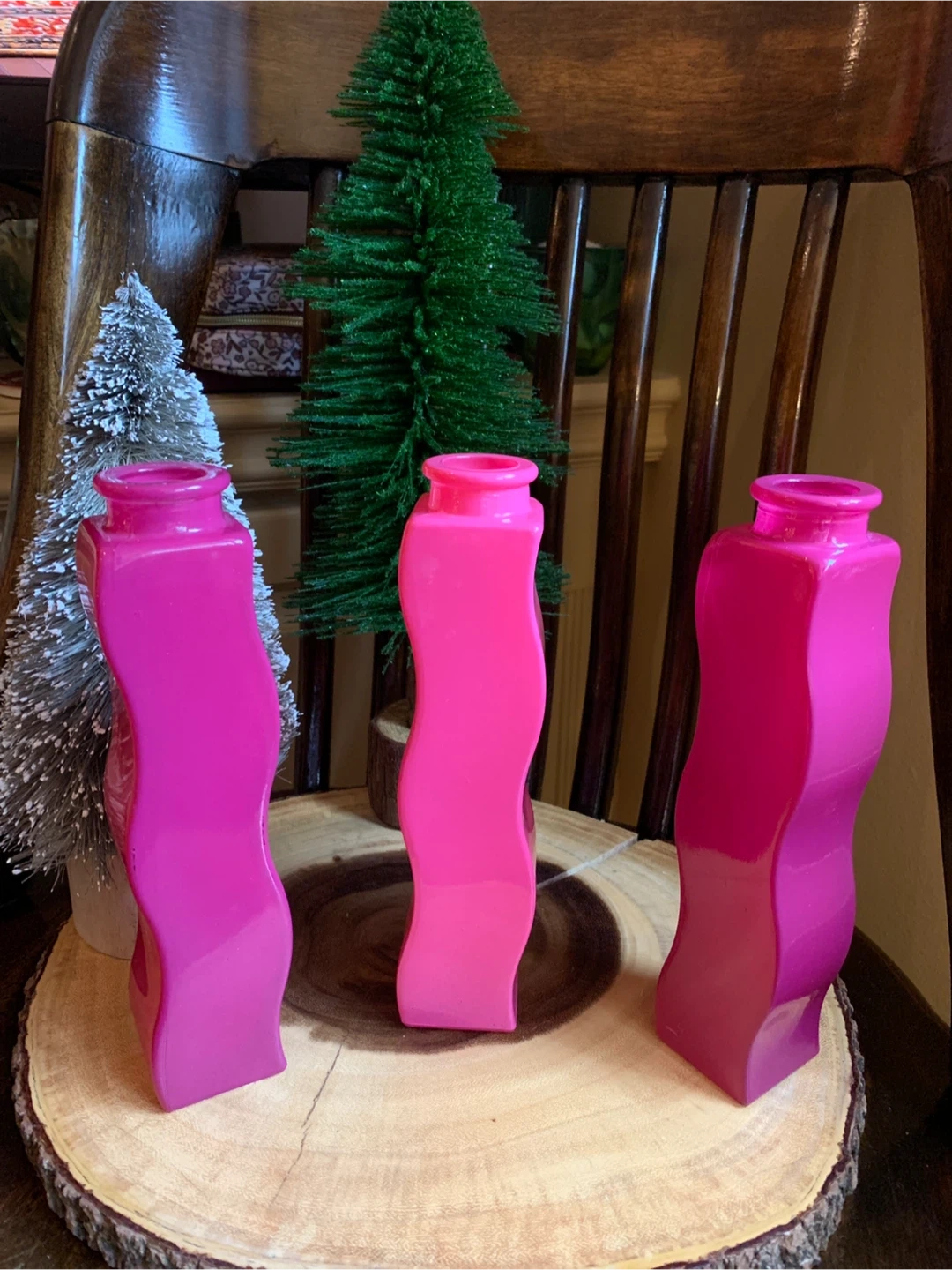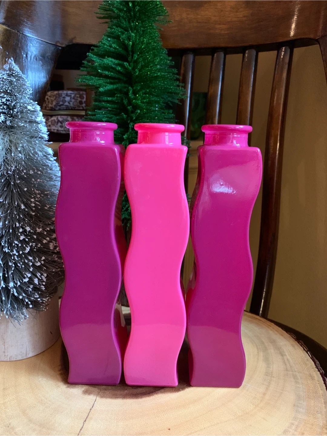A second lot of the iconic vintage IKEA squiggly vases. These are circa 1990’s Skämt vases and are no longer made. The three decorative vases are in varying shades of pink, fuchsia and raspberry. They have a unique wavy design and can fit together or be placed apart. They would add a pop of colour to any room!