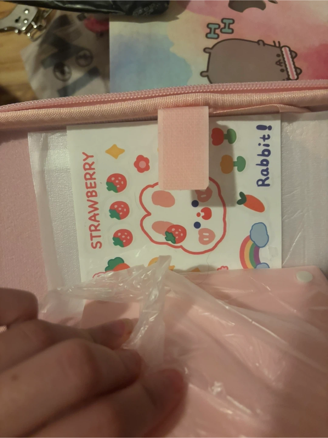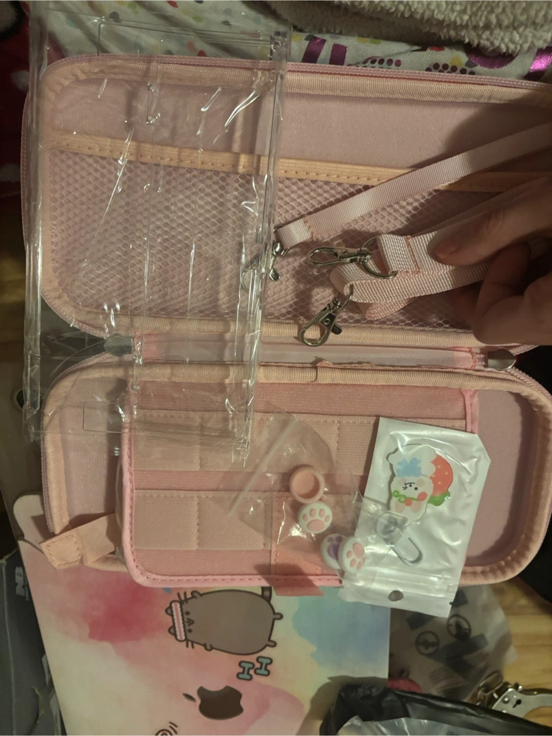 Selling a pink carrying case. It looks like it's in new condition and comes with a shoulder strap, thumb grips, and some cute stickers! Perfect for keeping your small items safe and organized for a Nintendo Switch